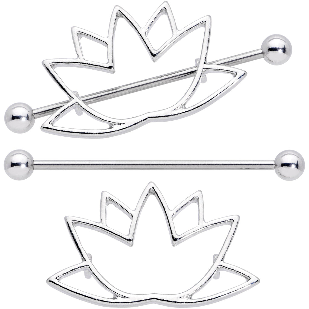 Open your mind to some mystical style with this 14 gauge nipple jewelry! It's made with 19mm wearable length 316L surgical grade stainless steel straight barbells with 5mm ball ends. They have a total length of 1 1/2" and the shield portion has a rise of 9/16". The shields features lotus flowers, completely done in openwork style. They have a gracefully airy style, perfect matching the metaphysical mind! Your nipple piercing jewelry can be as open as your mind with these lovely lotus flower nipple shields. Sold as a set of two.Specifications