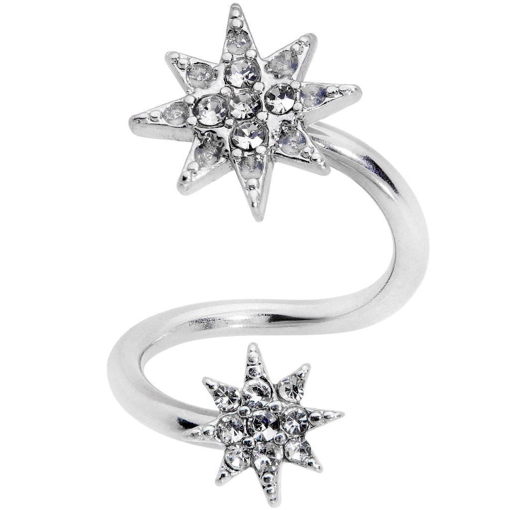 You'll never be lost when you can navigate by these stars! This 14 gauge twister earring is made with a 3/8" durable 316L surgical grade stainless steel spiral curved barbell. The ends feature eight-pointed star charms set with clear gems. Even better, this spiral jewelry works well in multiple piercings including the navel, lip, and eyebrow. You'll never be lost for options with this stunning navel piercing jewelry!