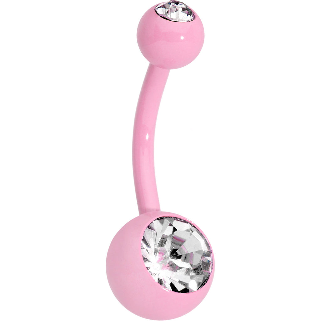 Express yourself with this simple 14 gauge belly piercing with a splash of pastel color. This 10mm in length light pink belly ring is made with an acrylic over 316L surgical grade stainless curved barbell, which features top and bottom clear gems. Collect every color for a variety of easy, simple style choices.