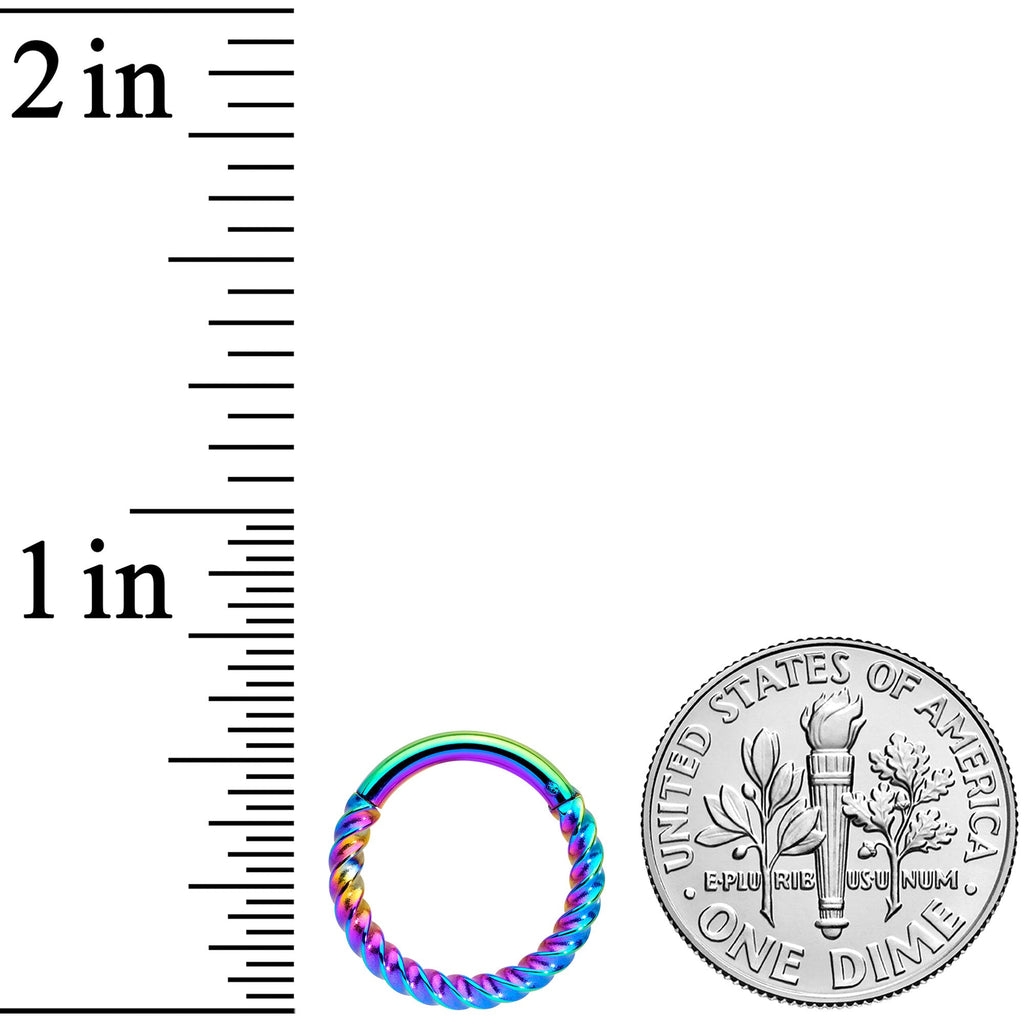 Add some twisted style to your septum piercings with this 14 gauge clicker ring! It's made with a 10mm rainbow PVD over 316L surgical grade stainless steel hinged curved barbell. It features a simple but striking twisted design that's basic but never boring. You'll love how the clicker design makes it super easy to insert and remove and you can wear it in multiple piercings including septum, stretched lobes, and some lip piercings! Now that's a twist you're sure to love!Specifications