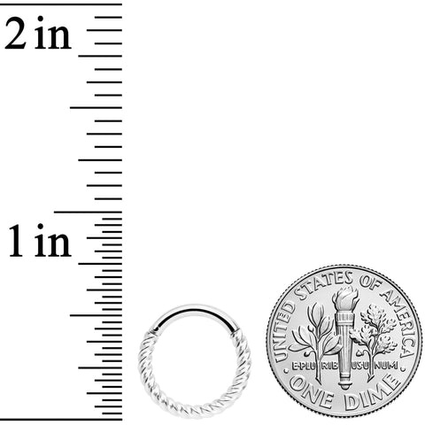 Add some twisted style to your septum piercings with this 14 gauge clicker ring! It's made with a 10mm durable 316L surgical grade stainless steel hinged curved barbell. It features a simple but striking twisted design that's basic but never boring. You'll love how the clicker design makes it super easy to insert and remove and you can wear it in multiple piercings including septum, stretched lobes, and some lip piercings! Now that's a twist you're sure to love!Specifications