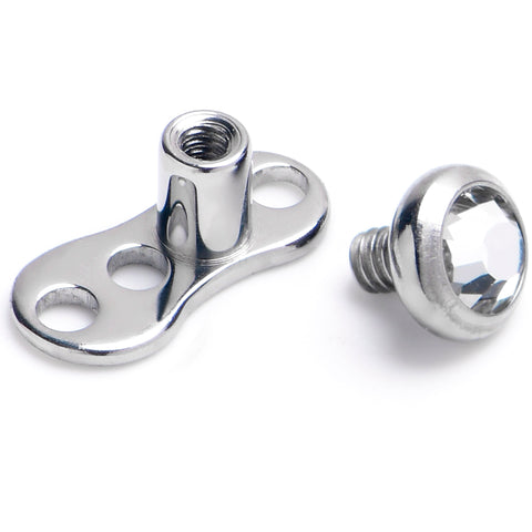 This 14 gauge dermal anchor base is made with ASTM F-136 titanium. It features a 2mm rise. It has a triple hole style anchor and an internally threaded post. It also features a 3mm bezel set clear gem top.Specifications