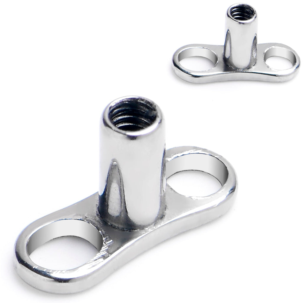 This 14 gauge dermal anchor base is made with ASTM F-136 titanium. It features an internally threaded design and a 3mm rise. It has a double hole anchor and a centrally located post. Top end not included.Specifications