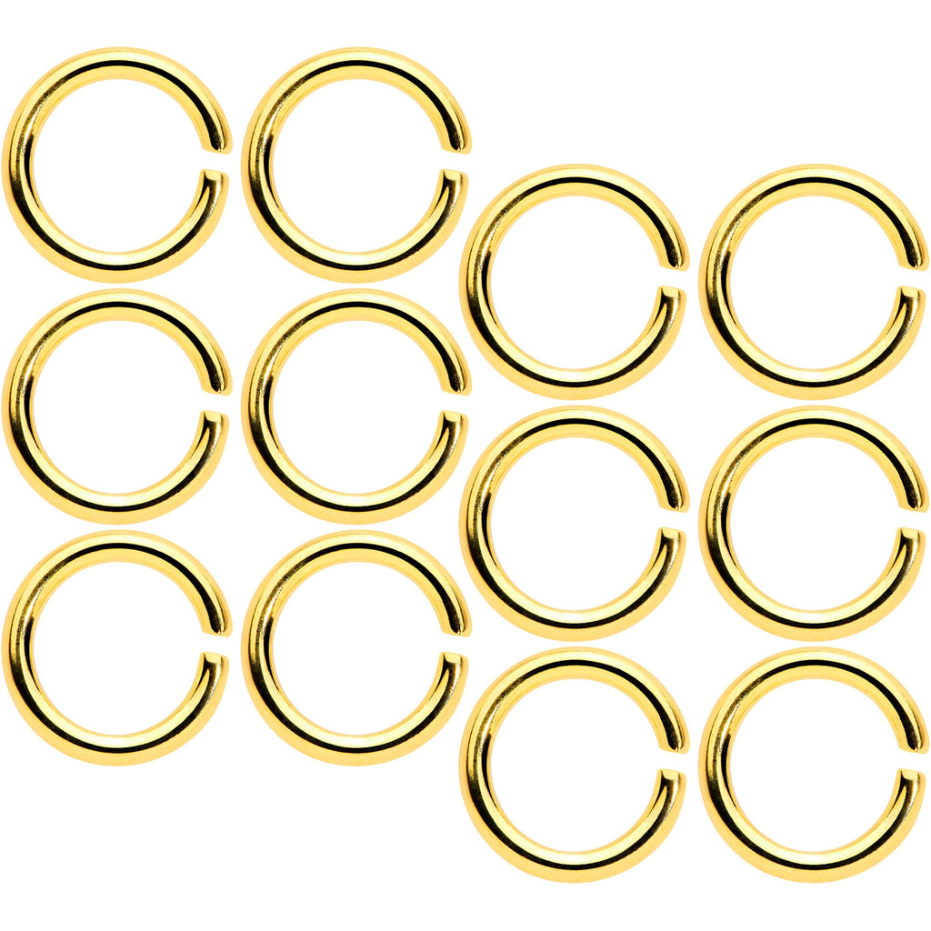 Whether you have multiple cartilage piercings and prefer a matching look or are simply prone to losing things, this set of 14 gauge cartilage rings has you covered. They're made with 8mm gold tone anodized over 316L surgical grade stainless steel circular rings for a colorful and comfortable feel. This cartilage jewelry is super easy to insert and remove - simply twist the ring open, insert, and then twist gently shut again. And you can rock these rings in multiple piercings including septum, navel, some eyebrow piercings, and stretched lobes! Sold as a set of twelve.