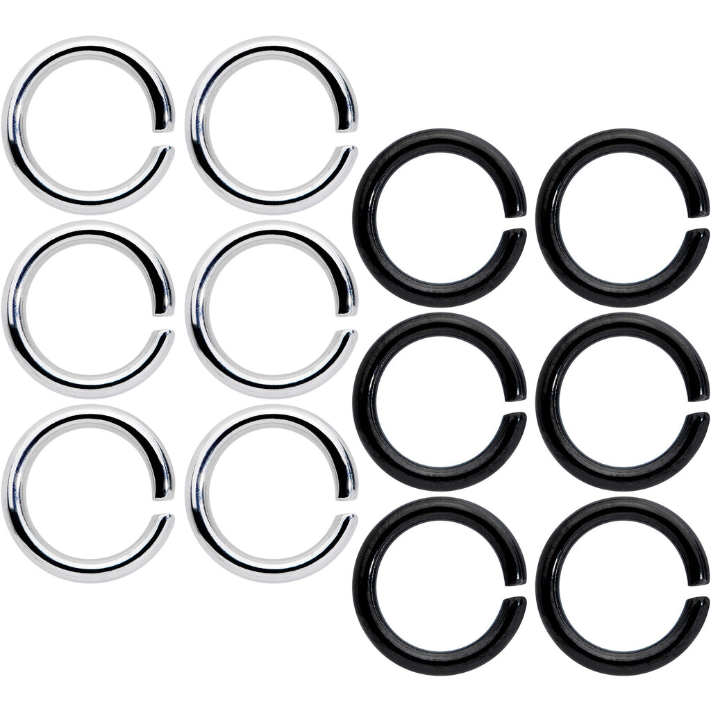 Whether you have multiple cartilage piercings and prefer a matching look or are simply prone to losing things, this set of 14 gauge cartilage rings has you covered. Six are made with 8mm durable 316L surgical grade stainless steel circular rings and the other six are made with 8mm black anodized over 316L surgical grade stainless steel circular rings for a colorful and comfortable feel. This cartilage jewelry is super easy to insert and remove - simply twist the ring open, insert, and then twist gently shut again. And you can rock these rings in multiple piercings including septum, navel, some eyebrow piercings, and stretched lobes! Sold as a set of twelve.Specifications
