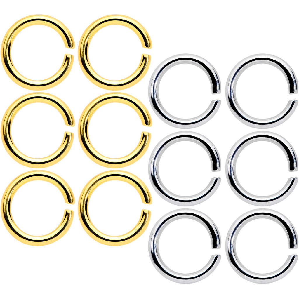 Whether you have multiple cartilage piercings and prefer a matching look or are simply prone to losing things, this set of 14 gauge cartilage rings has you covered. Six are made with 8mm durable 316L surgical grade stainless steel circular rings and the other six are made with 8mm gold tone anodized over 316L surgical grade stainless steel circular rings for a colorful and comfortable feel. This cartilage jewelry is super easy to insert and remove - simply twist the ring open, insert, and then twist gently shut again. And you can rock these rings in multiple piercings including septum, navel, some eyebrow piercings, and stretched lobes! Sold as a set of twelve.