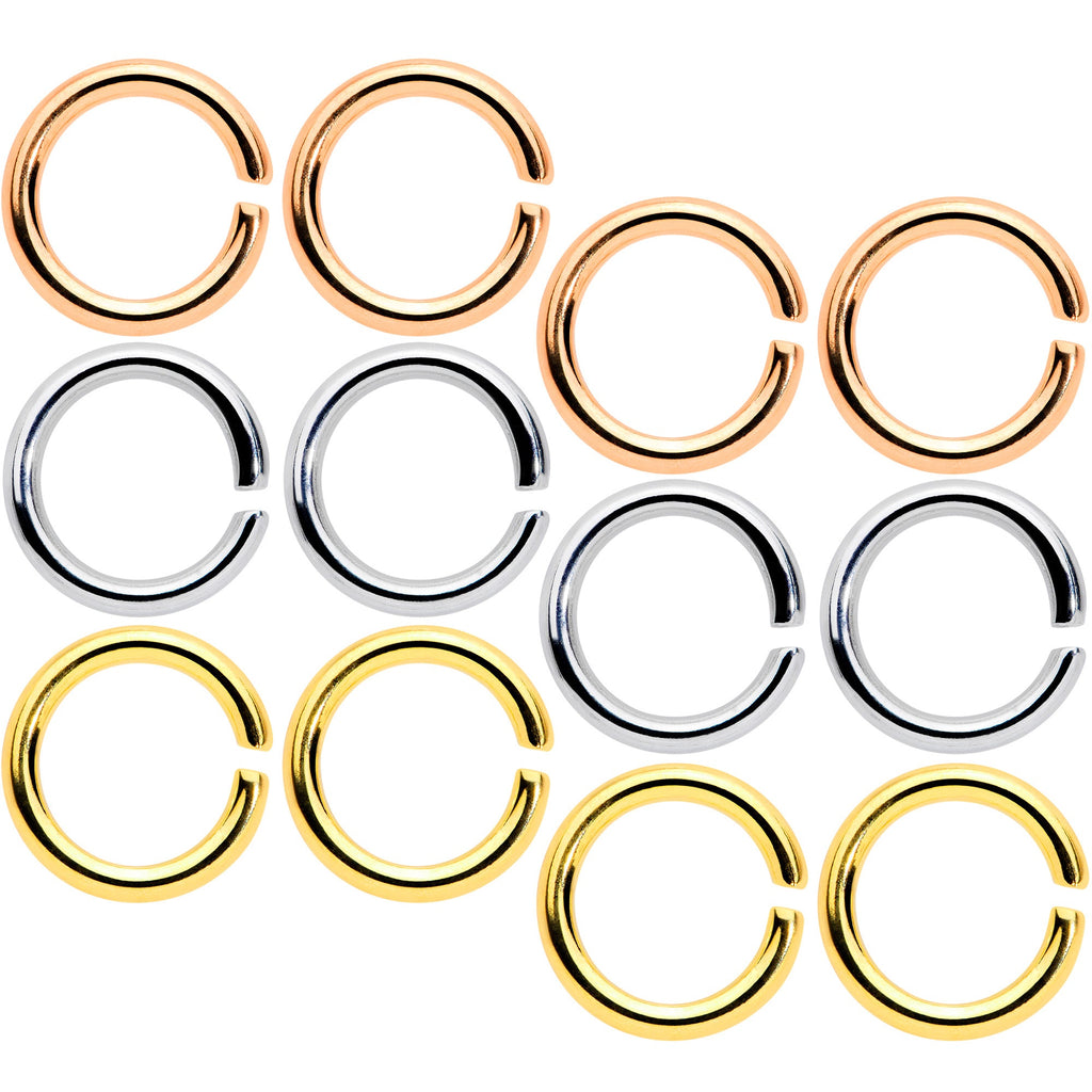Whether you have multiple cartilage piercings and prefer a matching look or are simply prone to losing things, this set of 14 gauge cartilage rings has you covered. Four are made with 8mm durable 316L surgical grade stainless steel circular rings and four are made with 8mm gold tone anodized over 316L surgical grade stainless steel circular rings for a colorful and comfortable feel. The remaining four are made with 8mm rose gold tone anodized over 316L surgical grade stainless steel seamless circular rings. This cartilage jewelry is super easy to insert and remove - simply twist the ring open, insert, and then twist gently shut again. And you can rock these rings in multiple piercings including septum, navel, some eyebrow piercings, and stretched lobes! Sold as a set of twelve.Specifications