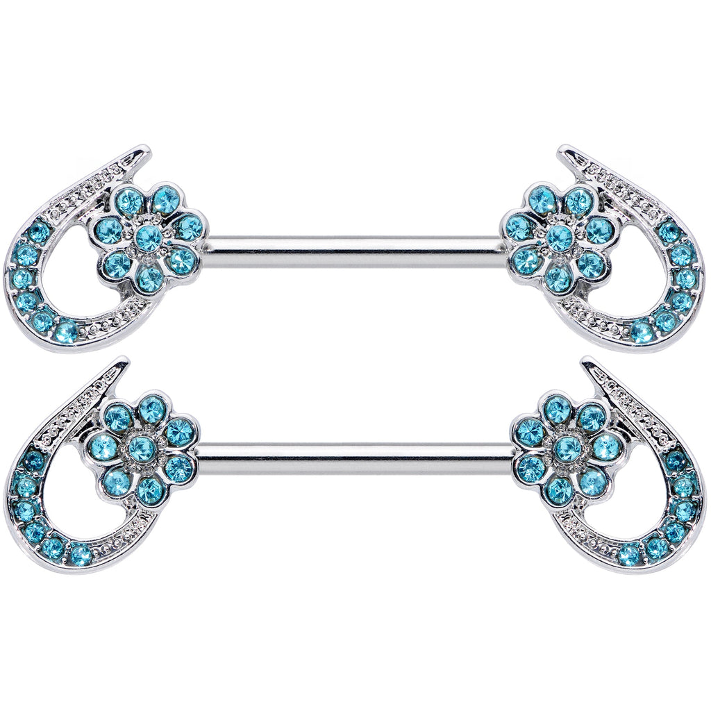 Half a heart this Valentine's Day with this 14 gauge nipple jewelry! It's made with 16mm durable 316L surgical grade stainless steel straight barbells. Each of the ends features a half heart charm set with aqua gems. Between the heart's ends is an aqua flower, composed of matching aqua gems. These half hearts are sure to steal your whole heart with the graceful style they'll bring to your nipple piercings! Sold as a set of two.Specifications
