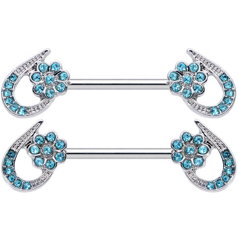 14 Gauge 5/8 Aqua Gem Heart Flower Barbell Nipple Ring Set