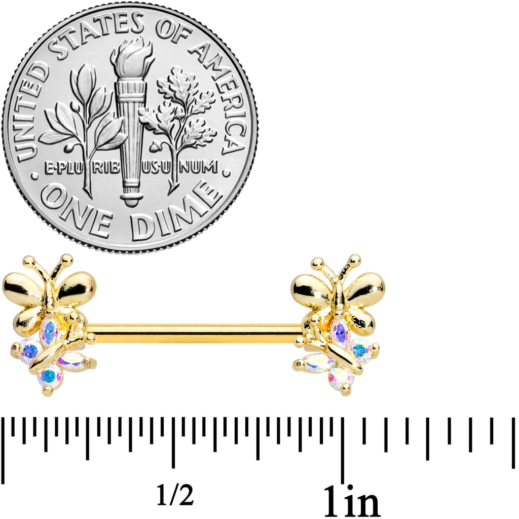 14G 5/8 Aurora CZ Gem Gold Tone Butterfly Barbell Nipple Set