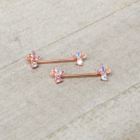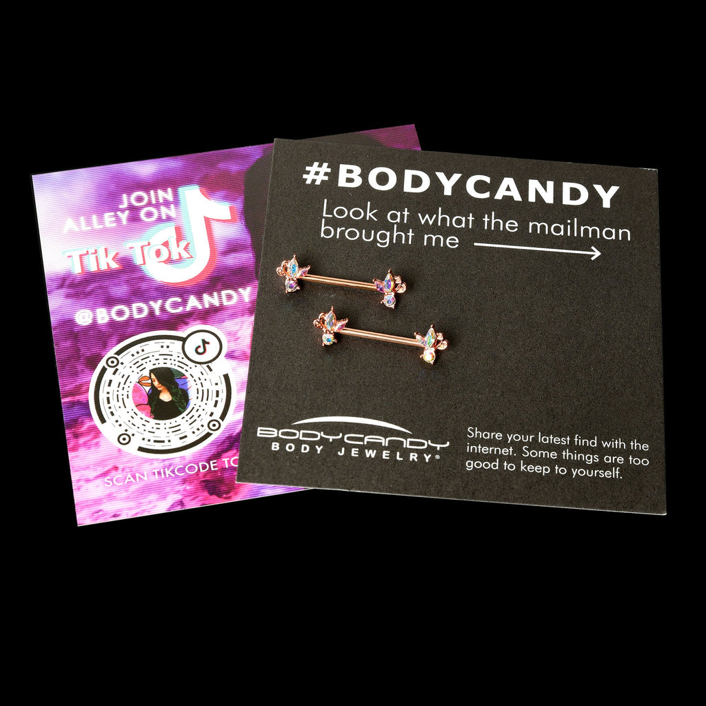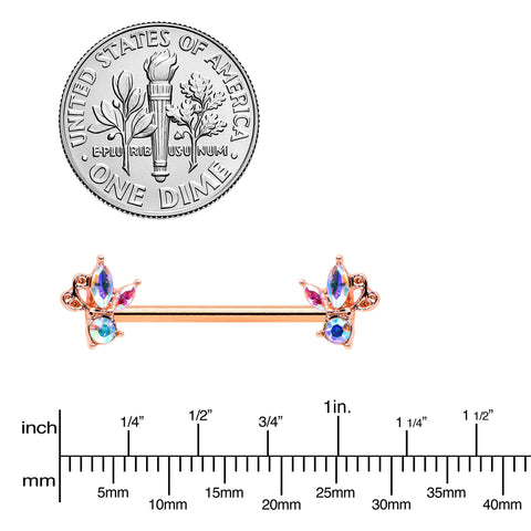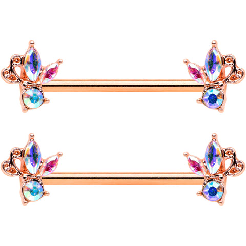 Get a look that wouldn't be out of place in any throne room with this 14 gauge nipple jewelry! It's made with 16mm rose gold tone PVD over 316L surgical grade stainless steel straight barbells. Each of the ends features a stylized fleur de lis charm, composed of aurora cubic zirconia gems. The abstracted style adds a modern touch to a timeless symbol - for a look that's perfect for all occasions. Mix antique style and modern for a look that's very now with these elegant nipple piercing rings. Sold as a set of two.Specifications