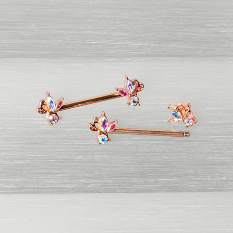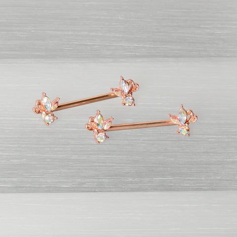 14 Gauge 5/8 Aurora CZ Gem Rosy Hue Fleur de Lis Barbell Nipple Ring Set