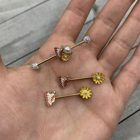 This 14 gauge nipple jewelry will have you thinking of springtime all year long! It's made with 16mm gold tone plated over 316L surgical grade stainless steel straight barbells. One end features a pink and white butterfly charm with an aurora color gem. The other end features a yellow flower charm and a matching orb set at the center of the flower. Go wild with these beautiful butterfly nipple rings! Sold as a set of two.Specifications