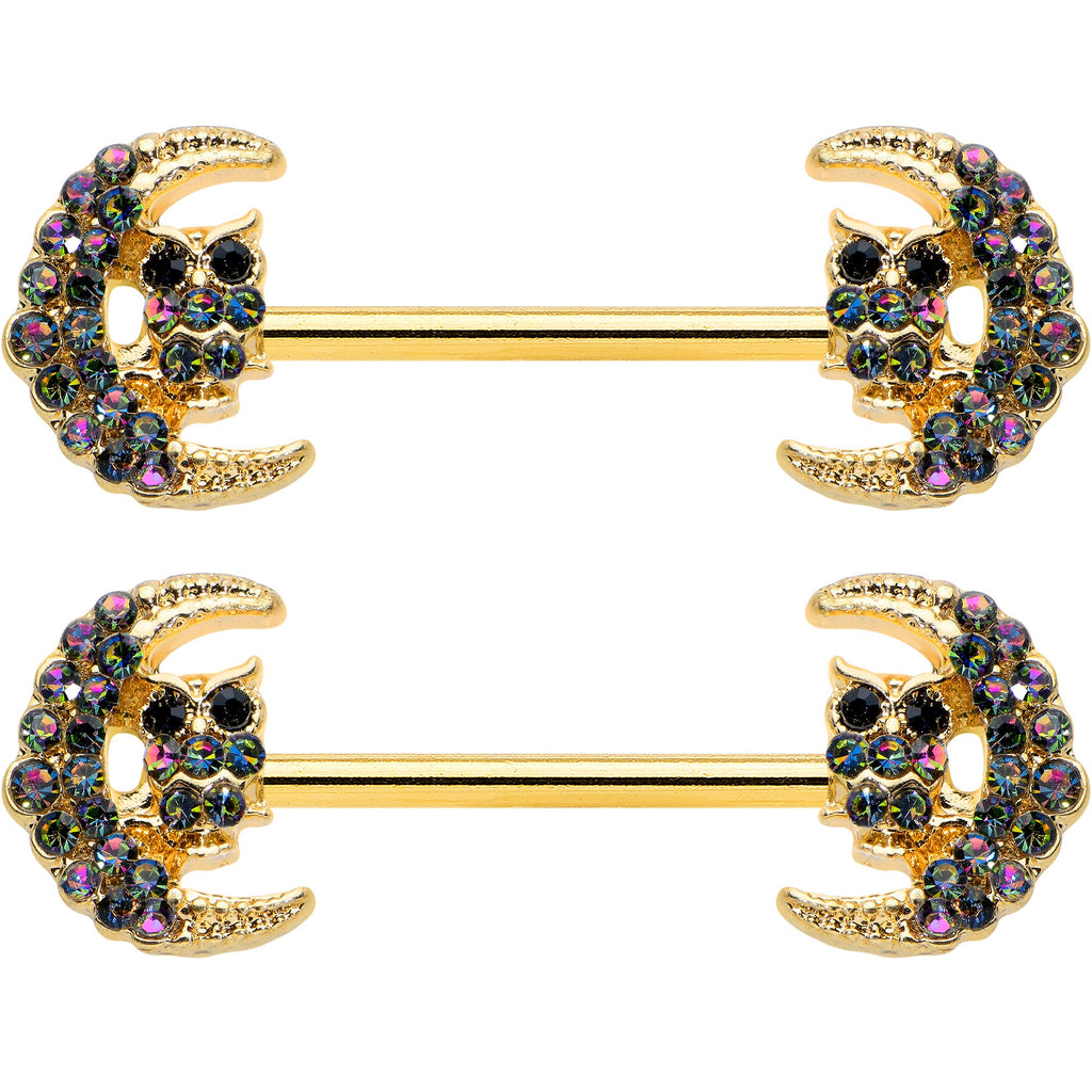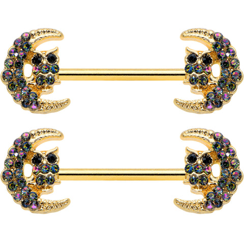 14 Gauge 5/8 Aurora Gem Gold Tone Owl Moon Barbell Nipple Ring Set