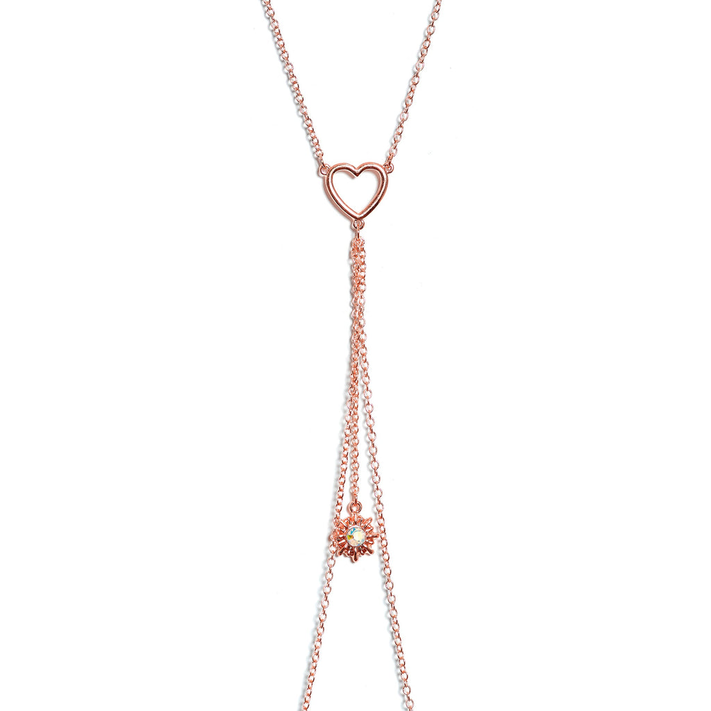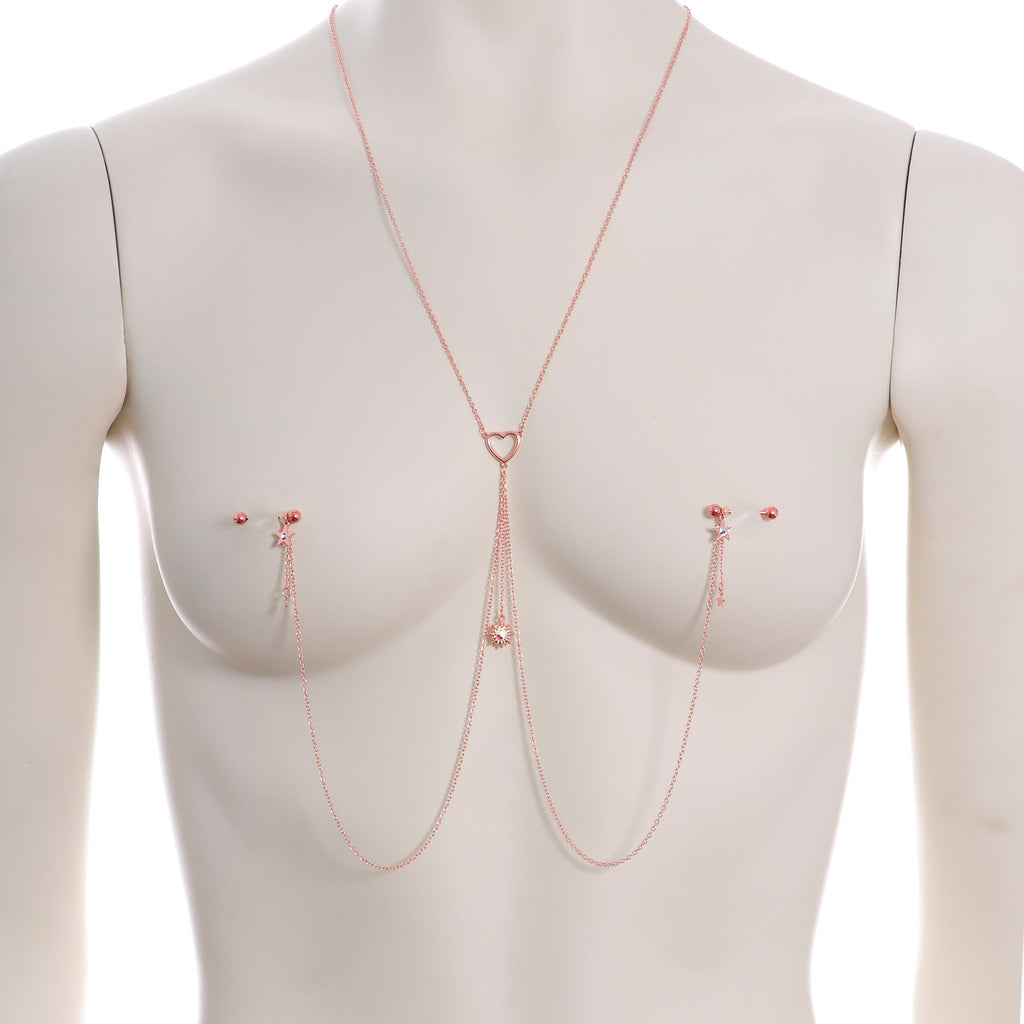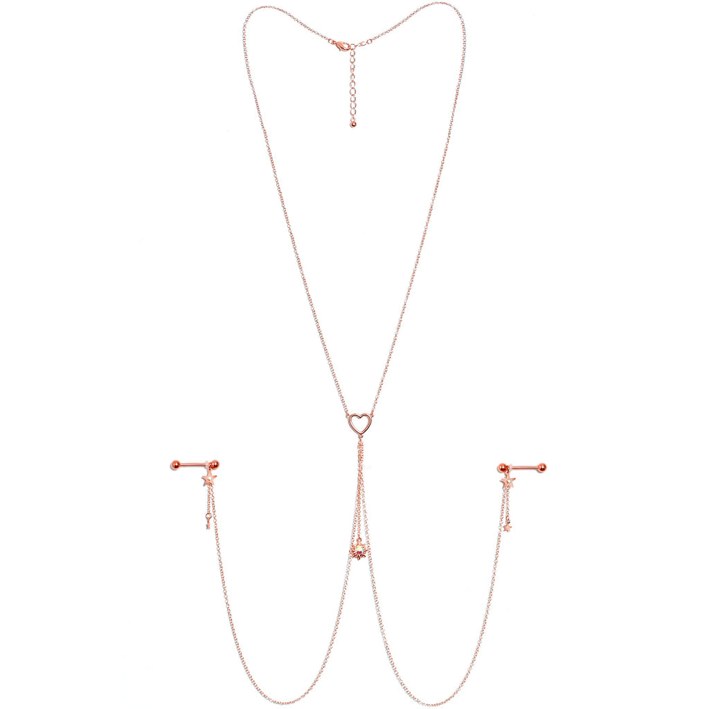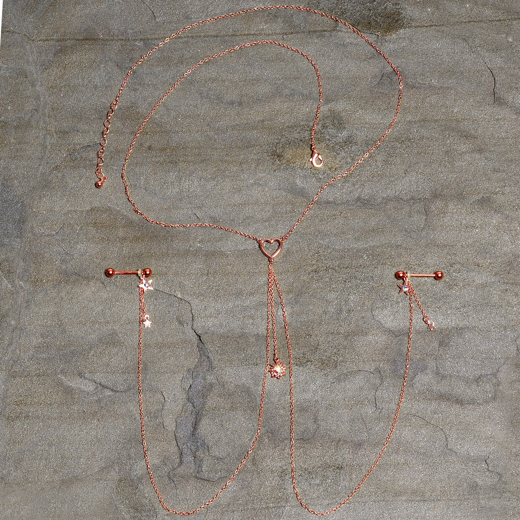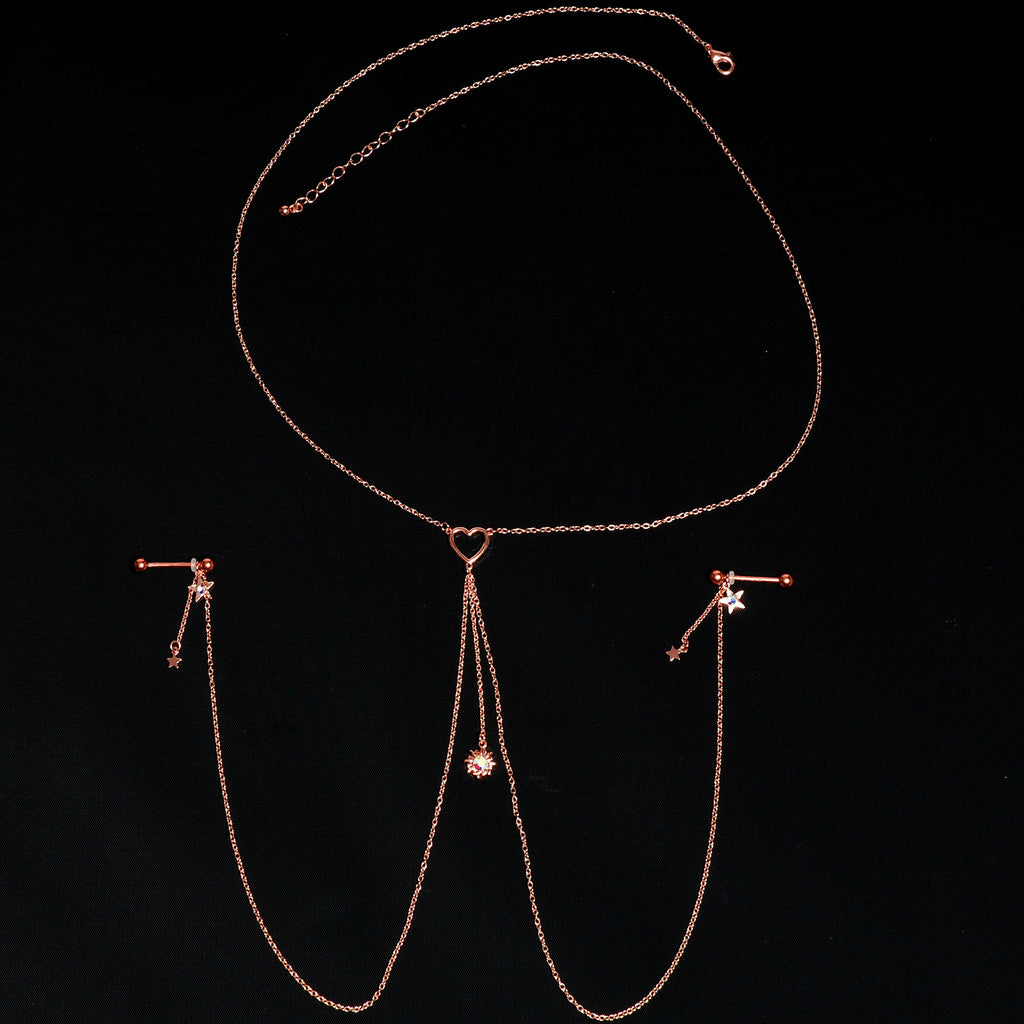 You're going to love this necklace to nipple chain to the stars and back! It features a 26" total length rose gold tone necklace that has a heart charm at the center. The heart has three lengths of matching chain dangling from it. The center one supports a gorgeous sun charm set at the center with an aurora gem. The other two chains are 11.5" (with some room for adjustment) and connect to the 16mm rose gold tone plated over 316L surgical grade stainless steel straight barbells with 5mm ball ends. Dangling from the barbells are rose gold tone star charms with a single aurora gem and tiny unadorned rose gold tone star charms than dangle from a matching length of chain. With this stunning necklace nipple chain, your nipple piercings are sure to be starsSpecifications