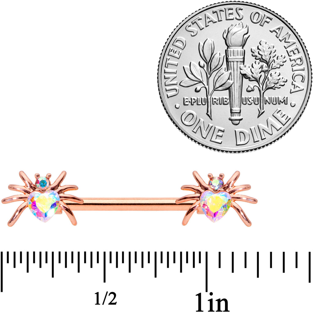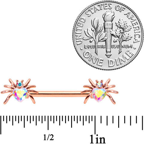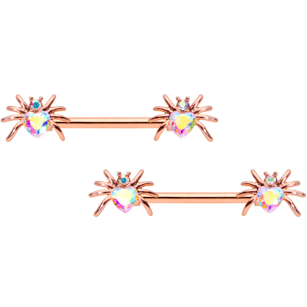 These little spiders will give you the shivers this Halloween...but not shivers of fear! This 14 gauge nipple jewelry is made with 16mm rose gold tone over 316L surgical grade stainless steel straight barbells. The ends feature beautiful spider charm ends with the spider's bodies made of heart-shaped Valentine's Day aurora gems with the head composed of smaller aurora gems. So whether you cherish creepy crawlies or appreciate arachnids, these nipple piercing rings are sure to snare you in their web! Sold as a set of two.