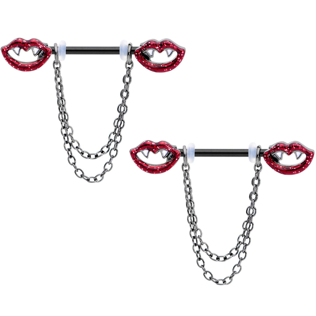 These vampire lips are so beautiful and inviting that you might actually welcome a little nibble from them! The 14 gauge nipple jewelry is made with 16mm black PVD over 316L surgical grade stainless steel straight barbells. The ends feature red shimmer mouths, partly open to show off the white fangs. There is also a double length of chain dangling from the barbells for added visual interest. These Halloween sexy nipple rings are sure to take a great big bite out of your heart! Sold as a set of two.Specifications