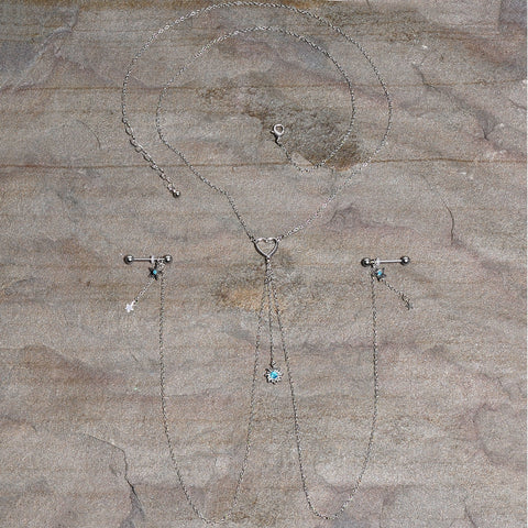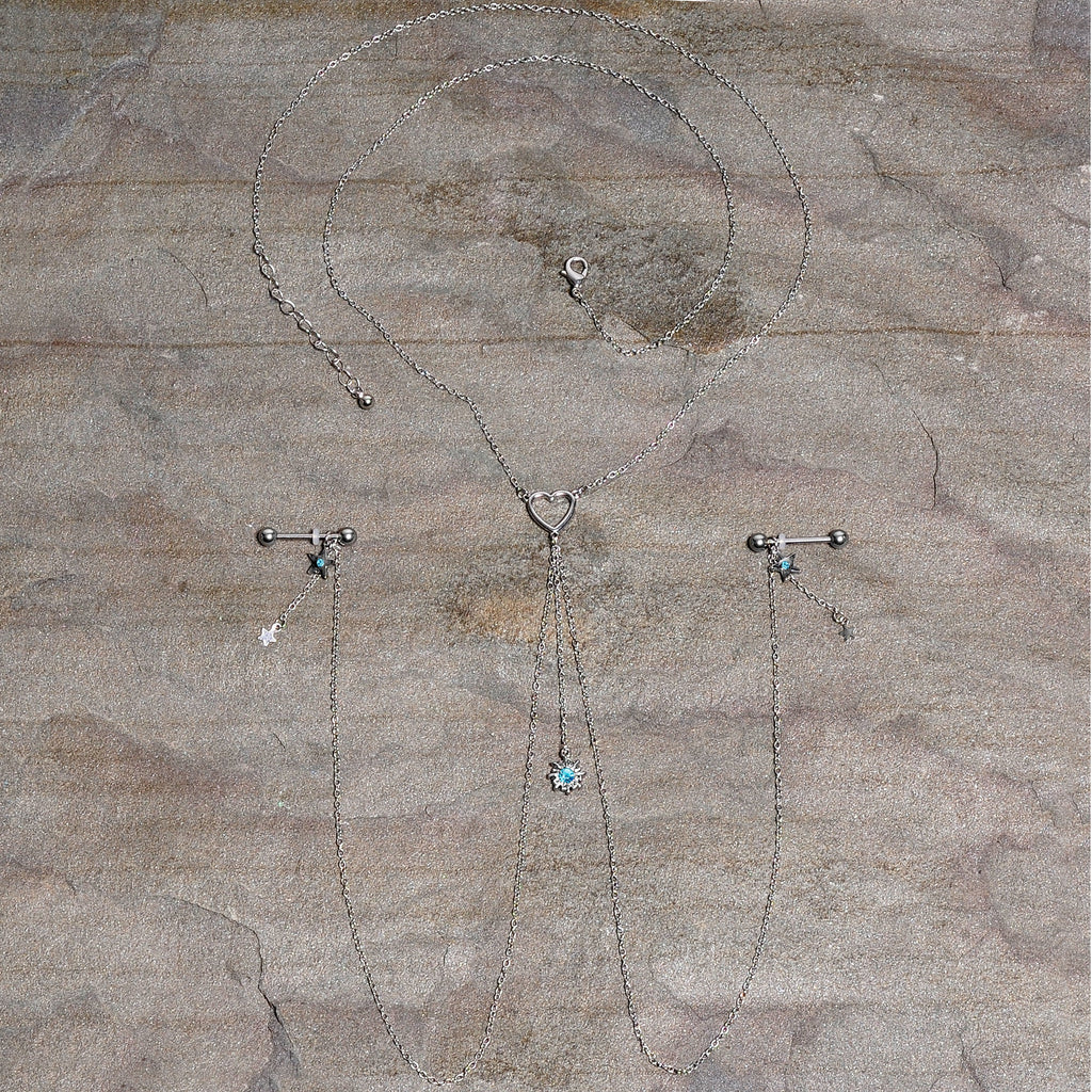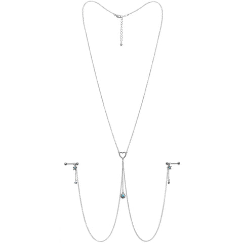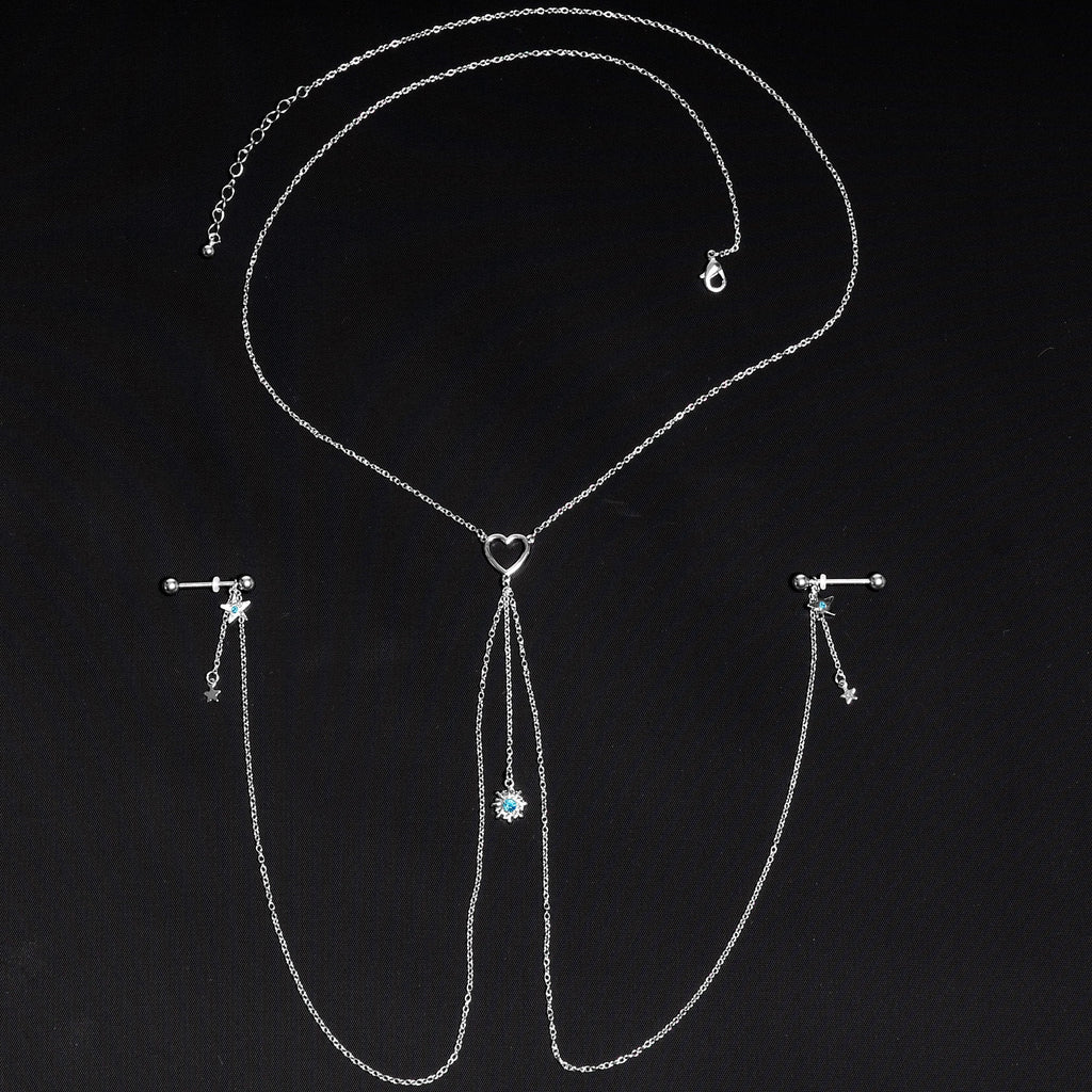 You're going to love this necklace to nipple chain to the stars and back! It features a 14" length necklace that has an openwork heart charm at the center. The heart has three lengths of matching chain dangling from it. The center one is 2" in length and supports gorgeous sun charm that's set with a blue gem in the center. The other two chains are 12" and connect to the 16mm durable 316L surgical grade stainless steel straight barbells with 5mm ball ends. Dangling from the barbells are star charms with blue gems and tiny unadorned stars than dangle from 1" lengths of chain. With this stunning necklace nipple chain, your pierced nipples are sure to be stars!Specifications