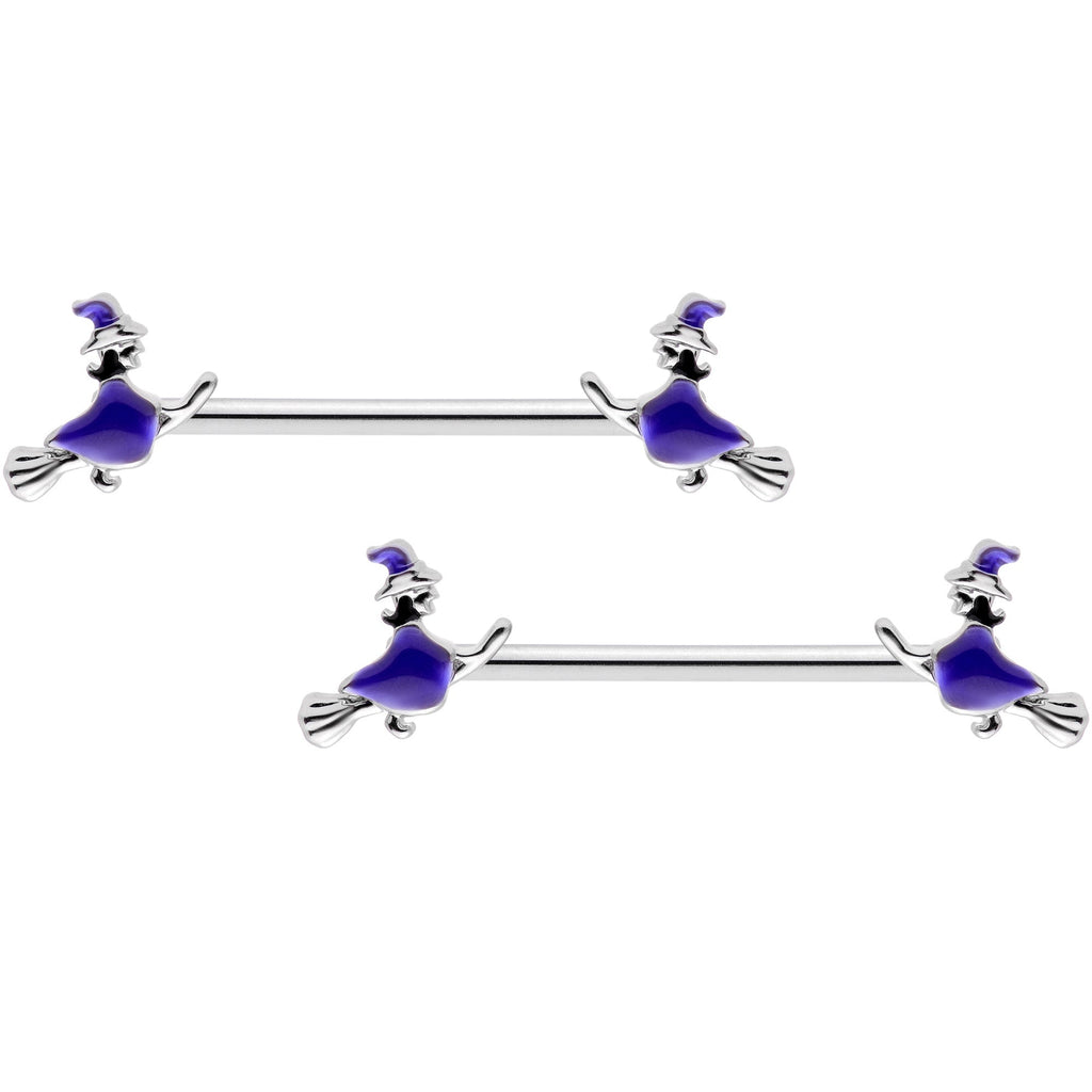 Who is that zooming through the night sky on a broom? It's the witch featured on this 14 gauge nipple jewelry! It's made with 16mm durable 316L surgical grade stainless steel straight barbells. The witch charm ends wear a blue dress and hat and sit perched on their brooms. This witch is sure to make some magic in your nipple piercing with these classic nipple rings! Sold as a set of two.Specifications