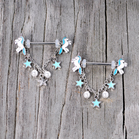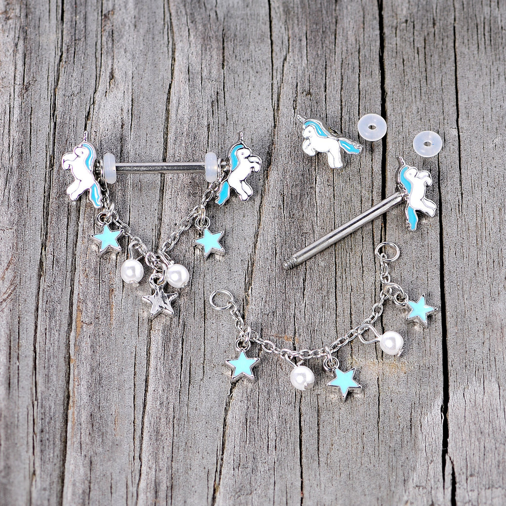Give these unicorns a starring role with this 14 gauge nipple piercing jewelry! It's made with 16mm durable 316L surgical grade stainless steel straight barbells with unicorn charm ends. The unicorns have white with blue manes and tails. Dangling from the barbell is a length of chain that features three blue star charms, which are interspersed with two small pearlescent white orbs for a look that adds a little extra indulgence to these whimsical nipple barbells. You're sure to have a look that's as one-of-a-kind as a unicorn! Sold as a set of two.Specifications