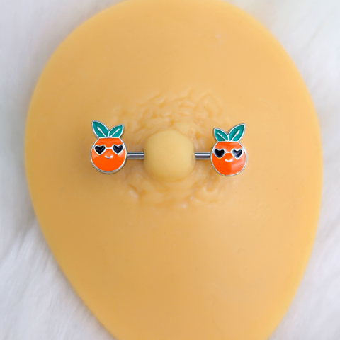 Tell the world that you always eat your citrus fruit with this 14 gauge nipple jewelry! These nipple rings are made with 16mm durable 316L surgical grade stainless steel straight barbells and feature fun cool shades orange fruit charm ends. The oranges have cheerful smiles and heart-shaped eyes. These sunshine fruit orange nipple rings are sure to be a healthy choice for your nipple piercings! Sold as a set of two.