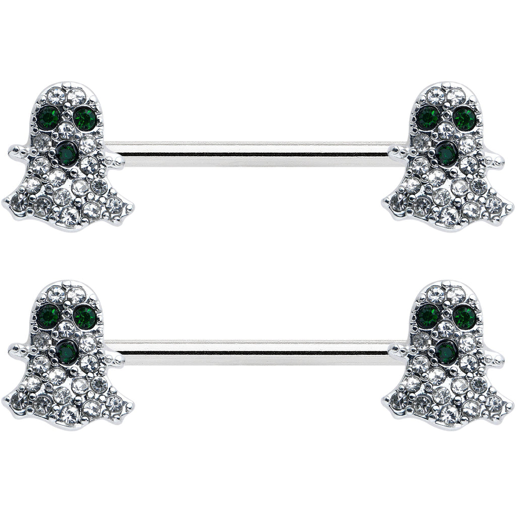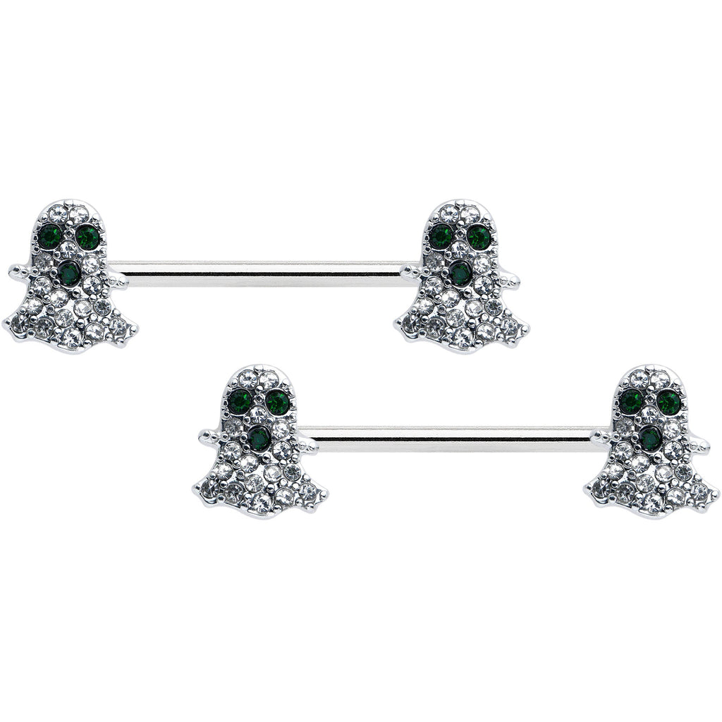 This 14 gauge nipple jewelry is booo-tiful! It's made with 16mm durable 316L surgical grade stainless steel straight barbells. Each of the ends features a charming little ghost charm with arms spread and mouth opened as it haunts your nipple piercings. The ghosts are paved in clear gems with black gem eyes and mouth for an added touch of Halloween glamour. This Halloween, your nipple piercings will look absolutely haunting with these sweet little ghost nipple rings! Sold as a set of two.Specifications