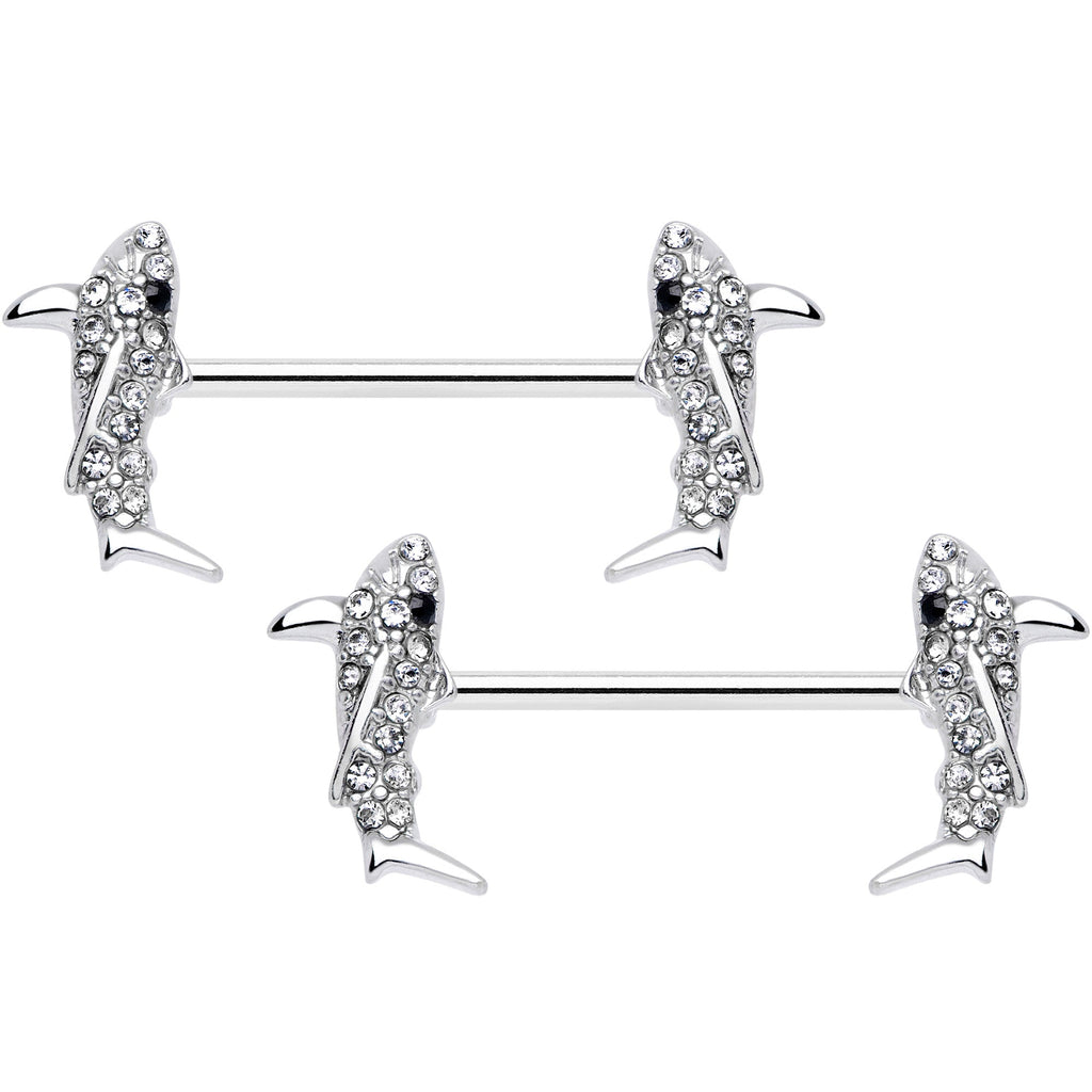 You've heard of having a bee in your bonnet.....but now you can have sharks in your nipples with this 14 gauge nipple piercing jewelry! It's made with 16mm durable 316L surgical grade stainless steel straight barbells. The ends each feature a shark charm with set with a small black gem eye and embellished with clear gems for an added look of luxurious realism. Let this nipple jewelry take a bite out of your nipple piercings! Sold as a set of two.