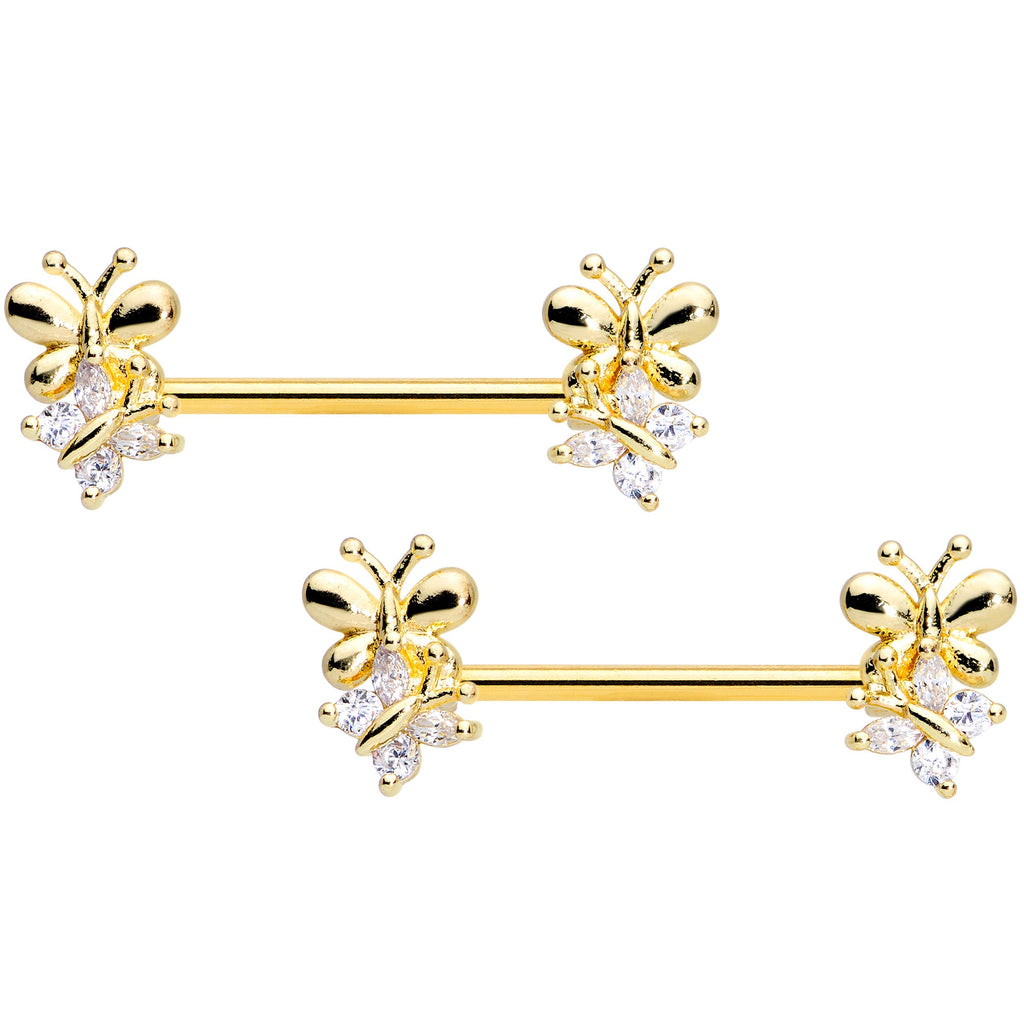 What could be better than one butterfly? Two butterflies! This 14 gauge nipple jewelry is made with 16mm gold tone plated over 316L surgical grade stainless steel straight barbells. The ends each feature a pair of butterfly charms with a butterfly sitting beneath a butterfly composed of clear cubic zirconia gems at a slight angle. Spread your wings and give your nipple piercings a whole new look with these bewitching butterflies! Sold as a set of two.Specifications