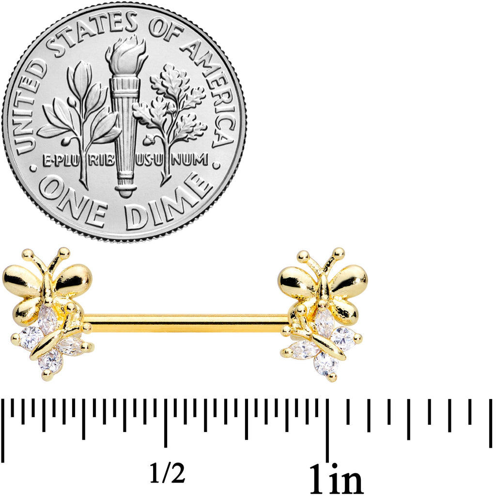 14 Gauge 5/8 Clear CZ Gem Gold Tone Butterfly Barbell Nipple Set