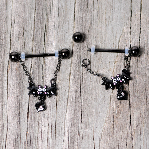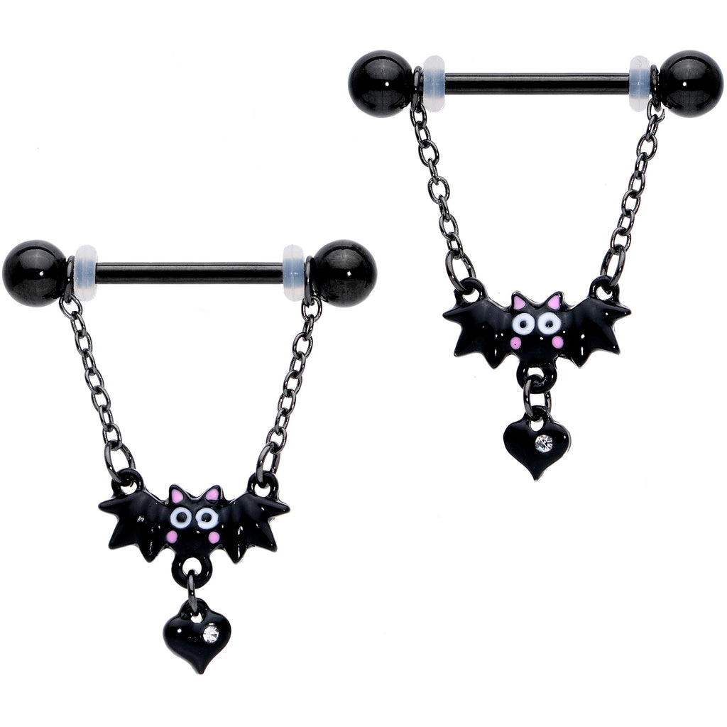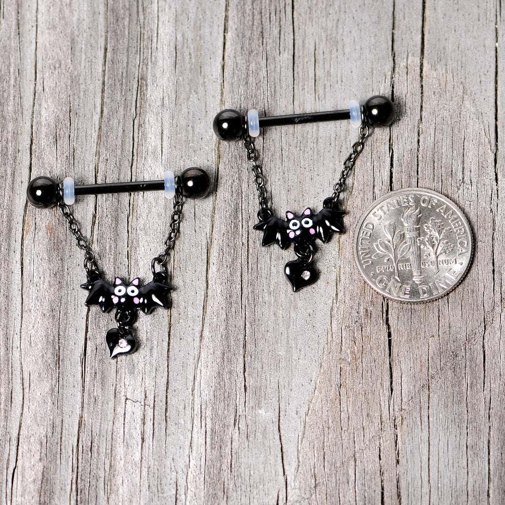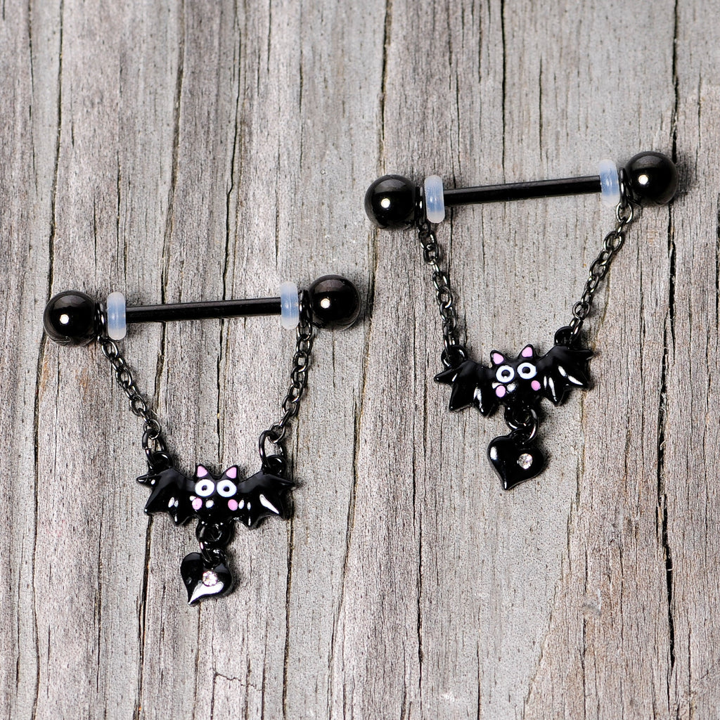If Halloween is your favorite holiday, you're sure to be besotted with this 14 gauge nipple jewelry! It's made with 16mm black plated over 316L surgical grade stainless steel straight barbells with 5mm ball ends. The barbell supports a length of matching chain that can be adjusted along the length of the barbells. Dangling from the center of the chain is an adorable little bat charm. This little sweetie is carrying a little heart, set with a tiny clear gem. This beautiful bat jewelry is sure to steal your heart as well! Sold as a set of two.