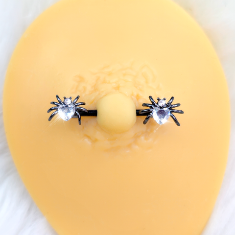 These little spiders will give you the shivers the Halloween.....but not shivers of fear! This 14 gauge nipple jewelry is made with 16mm black plated over 316L surgical grade stainless steel straight barbells. The ends feature beautiful spider charm ends, with the spider's bodies made of Valentine's Day heart-shaped clear gems with the head composed of smaller clear gems. So whether you cherish creepy crawlies or appreciate arachnids, these nipple piercing rings are sure to snare you in their web! Sold as a set of two.