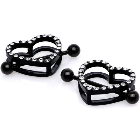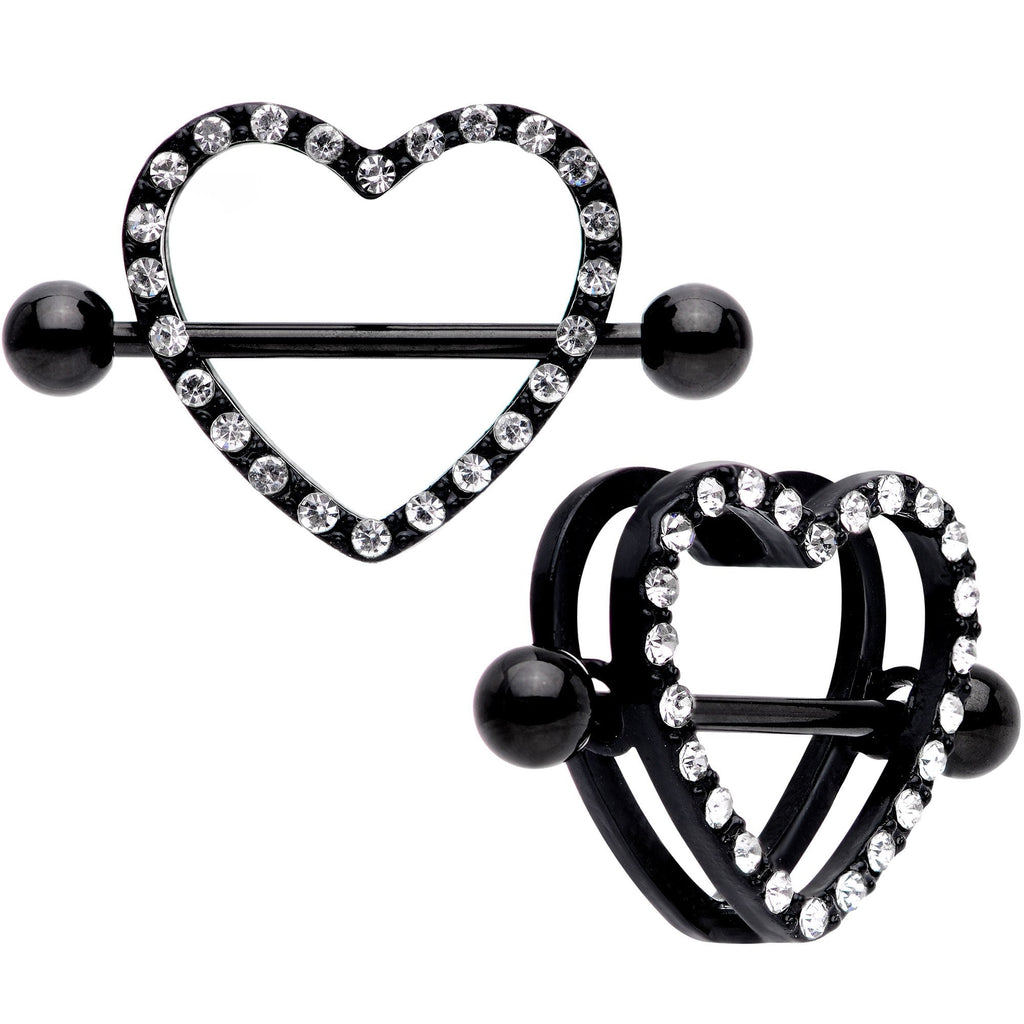 Get lost in love whenever you dress your breasts with this pretty pair of 14 gauge heart nipple piercings. Made with 16mm black anodized over 316L surgical grade stainless steel straight barbells, this navel jewelry features a double layered heart shield charm set with clear gems and is sold as a set of two.