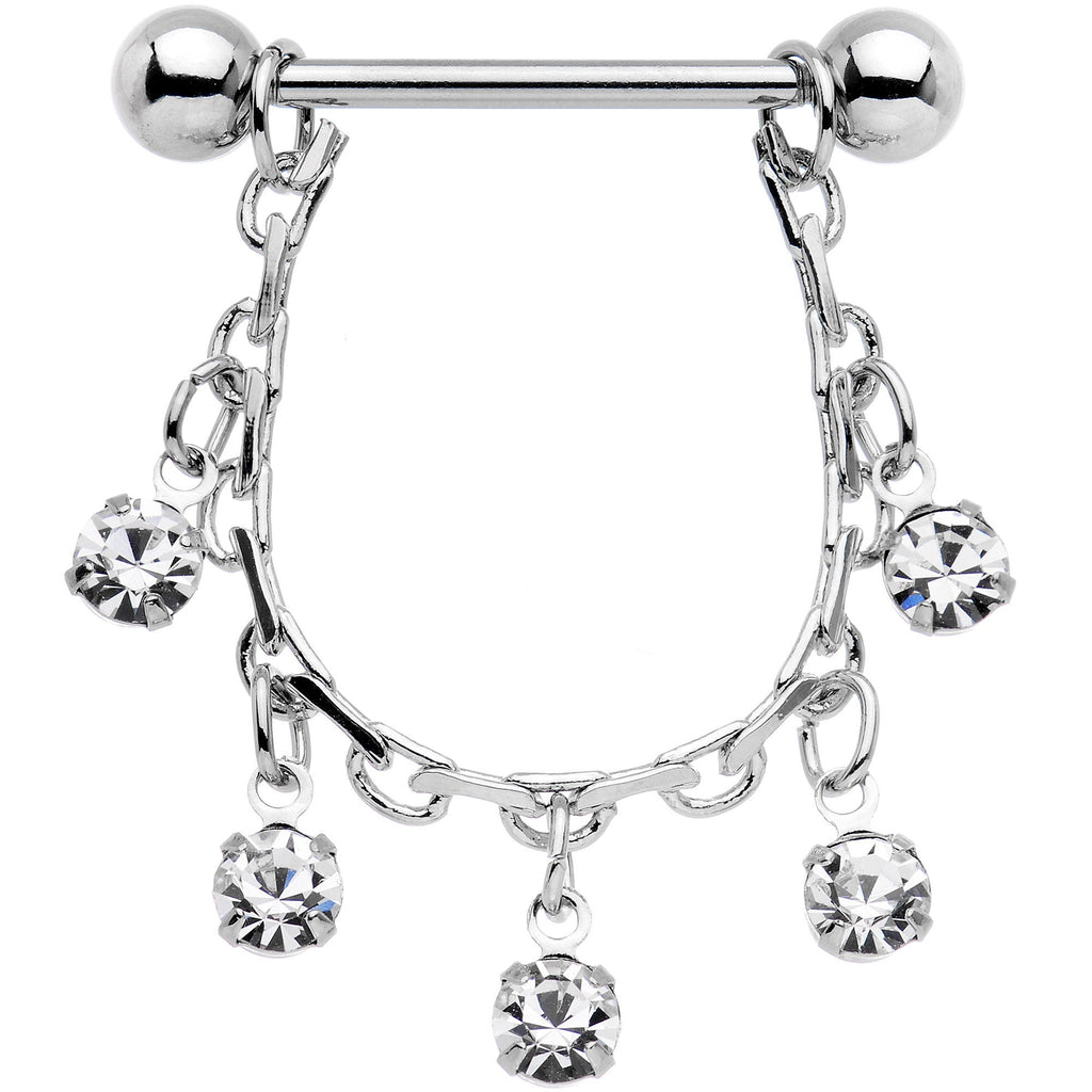 14 Gauge 5/8" Clear Gem Chain Drop Dangle Nipple Ring Set