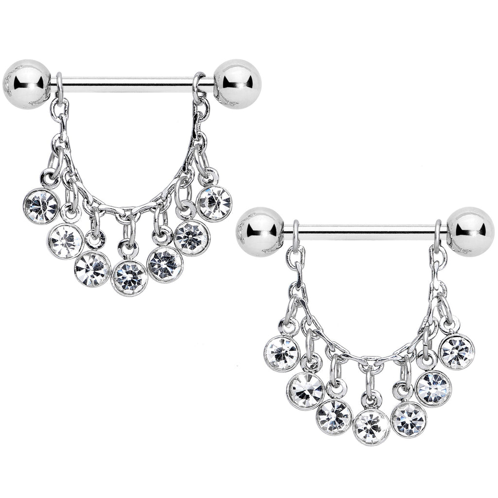Take your nipple piercings out to the fashion fringe with these 14 gauge nipple rings! They're made with 16mm durable 316L surgical grade stainless steel straight barbells with 5mm ball ends. The barbells support a dangling chain that has seven circular clear gems hanging from it, giving them the look of fringe. They'll shift with every movement of your body, making your nipple piercings impossible to ignore! Display some dazzling dangling fringed finery with this stunning nipple jewelry! Sold as a set of two.Specifications