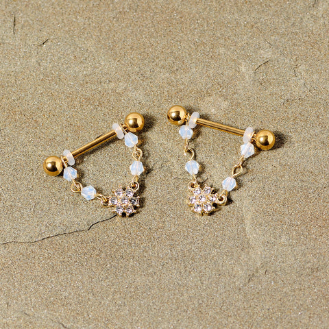 14 Gauge 5/8 Clear Gem Gold Tone Dainty Flower Dangle Nipple Ring Set