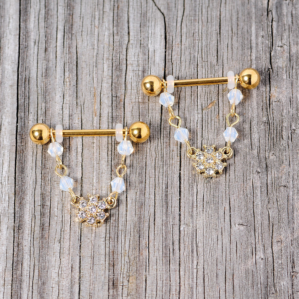 What could be sweeter than this dainty 14 gauge flower-themed nipple jewelry? It's made with 16mm gold tone plated over 316L surgical grade stainless steel straight barbells with 5mm ball ends. It features a dangling chain embellished with two pairs of clear gems. At the center of the chain is a petite flower charm set with more clear gems that add further style and visual impact. Best of all, you can slide the chain up and down the length of the barbell so you get just the look you're after. Let these fetching flowers add some sweet and sassy style to your piercings with these beautiful floral nipple rings. Sold as a set of two.Specifications