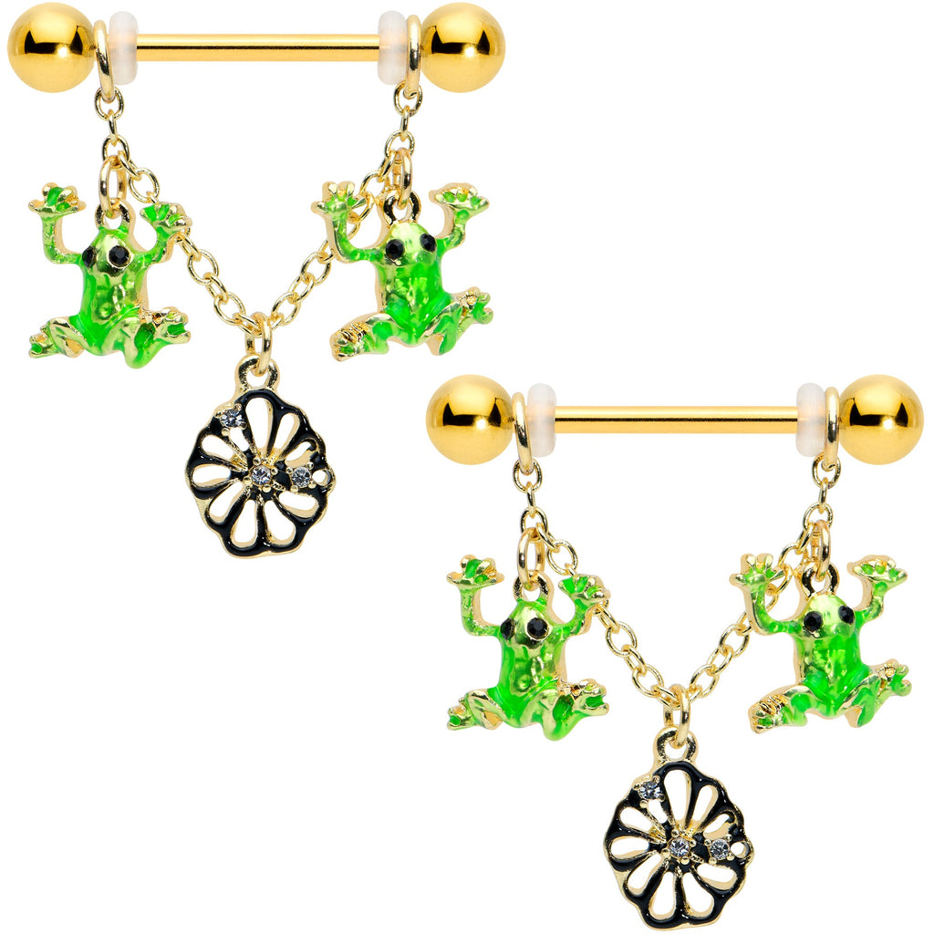 Bring the great outdoors inside with this 14 gauge nipple jewelry! It's made with 16mm gold tone PVD over 316L surgical grade stainless steel straight barbells with 5mm ball ends. Dangling from each is a length of matching chain which supports a flower charm with openwork petals. The flower is embellished with clear gems. The flower is flanked by a pair of green tree frog charms that even have realistic little toes! You can practically smell the fresh air when you're rocking this frog and flower nipple piercing jewelry! Sold as a set of two.Specifications