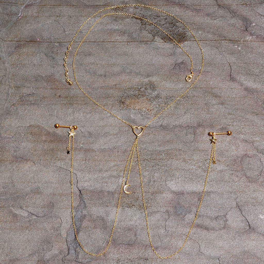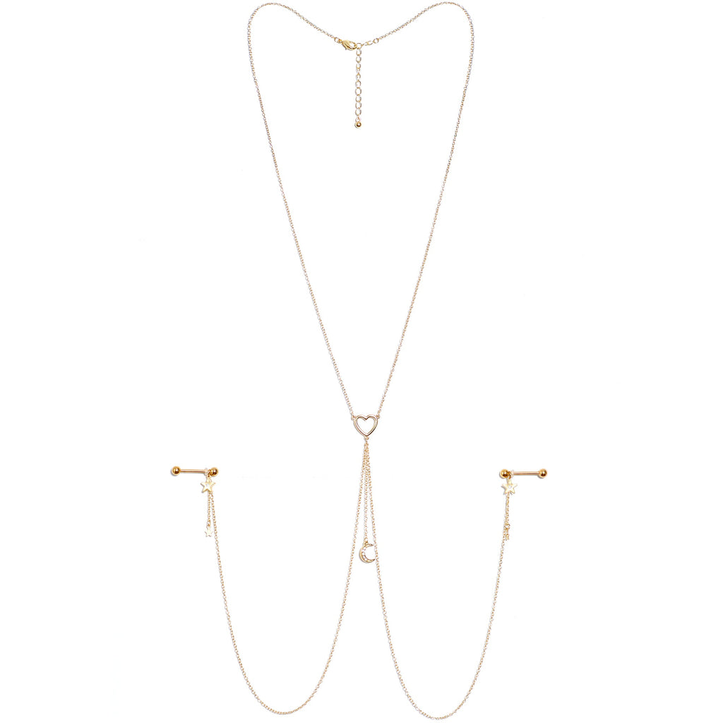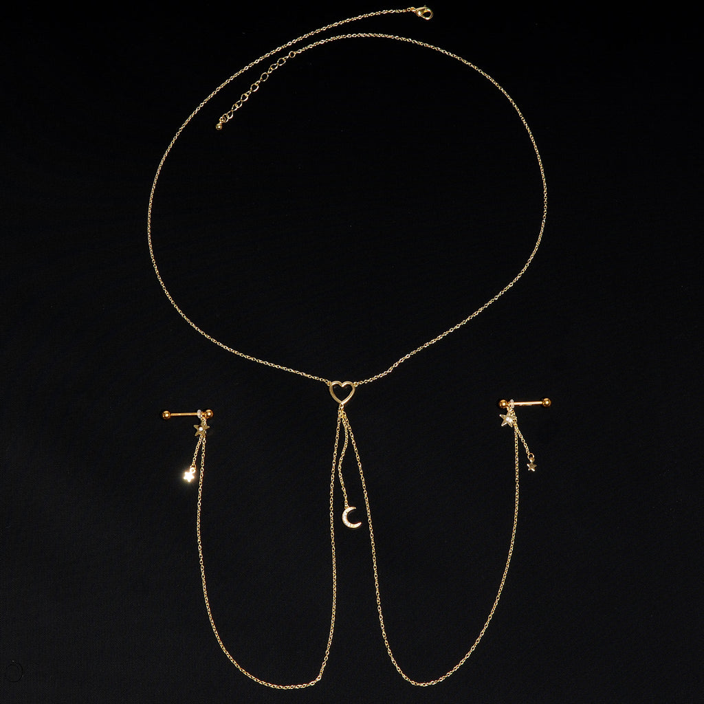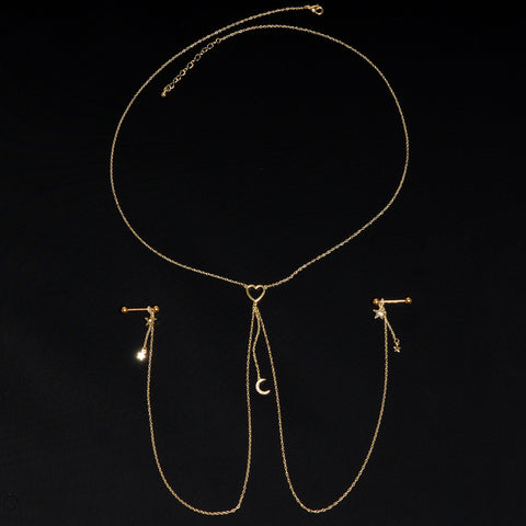 You're going to love this necklace to nipple chain to the stars and back! It features a 14" length gold tone necklace that has an openwork heart charm at the center. The heart has three lengths of matching chain dangling from it. The center one is 2" in length and supports gorgeous crescent moon charm set with clear gems. The other two chains are 12" and connect to the 16mm gold tone plated over 316L surgical grade stainless steel straight barbells with 5mm ball ends. Dangling from the barbells are gold tone star charms with a single clear gem and tiny unadorned gold tone star charms than dangle from a 1" length of chain. With this stunning necklace nipple chain, your nipple piercings are sure to be stars!Specifications