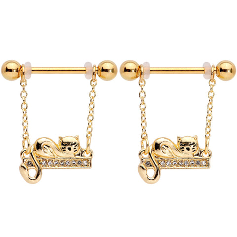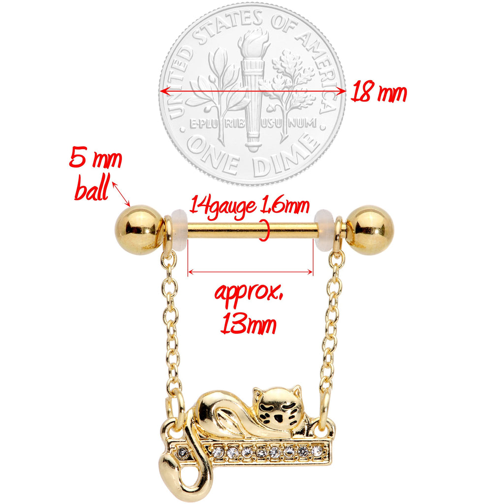 14G 5/8 Clear Gem Gold Tone Nap Cat Dangle Nipple Ring Set