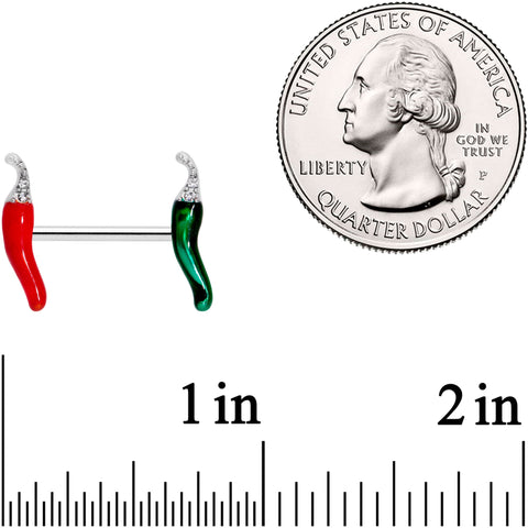 Oooh, that is some spicy nipple jewelry! These 14 gauge nipple rings are made with 16mm durable 316L surgical grade stainless steel straight barbells. The ends feature chili pepper charms, one red and one green. The stems are set with clear gems for a touch of elegance that balances out a whimsical and modern look. These are sure to give your nipple piercings a kick! Sold as a set of two.Specifications