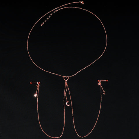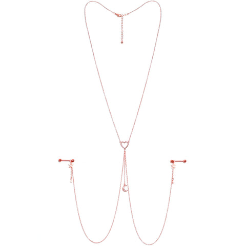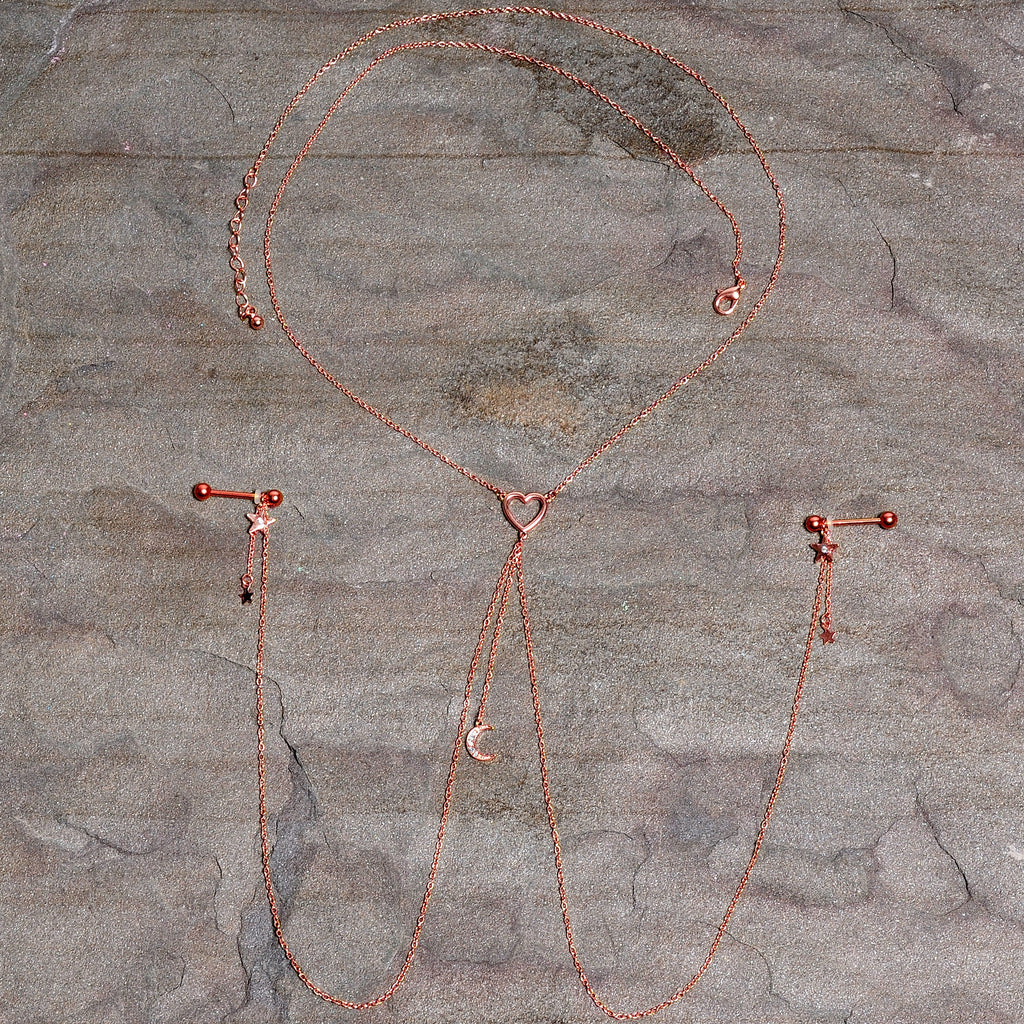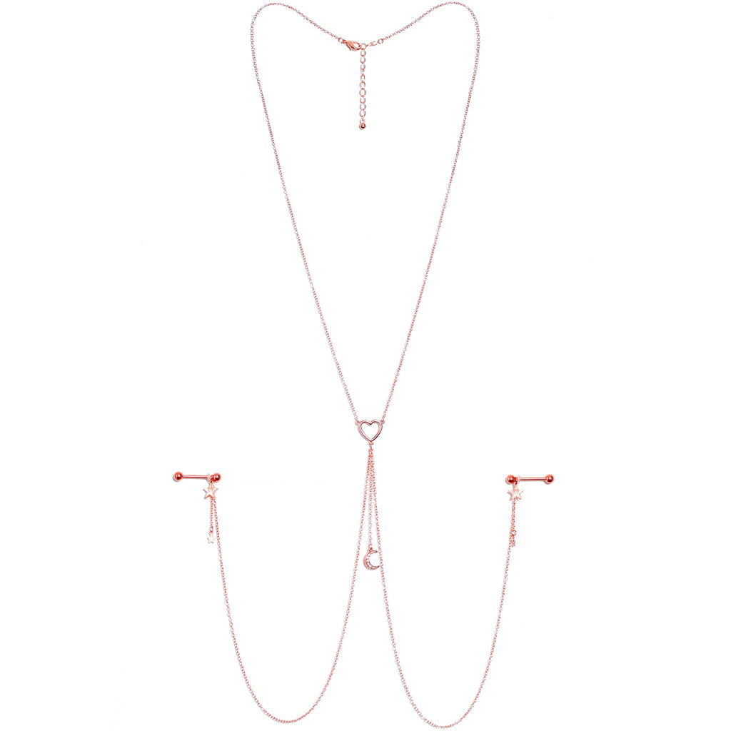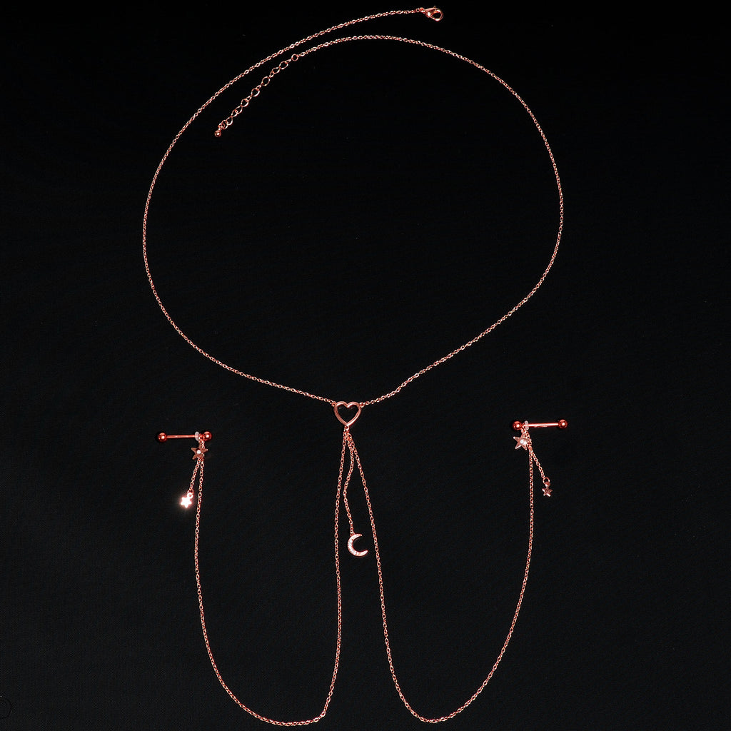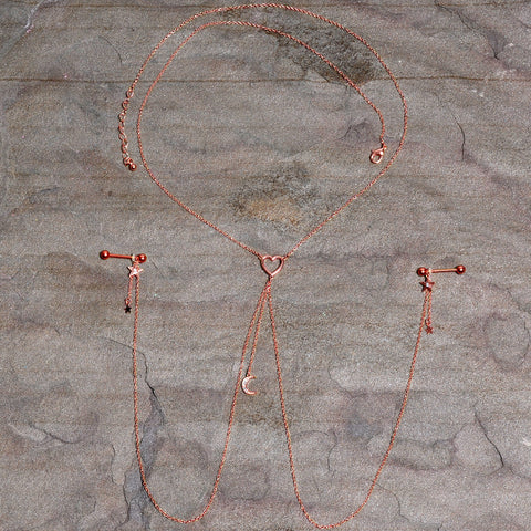You're going to love this necklace to nipple chain to the stars and back! It features a 26" total length rose gold tone necklace that has a heart charm at the center. The heart has three lengths of matching chain dangling from it. The center one supports a gorgeous crescent moon charm set with clear gems. The other two chains are 11.5" (with some room for adjustment) and connect to the 16mm rose gold tone plated over 316L surgical grade stainless steel straight barbells with 5mm ball ends. Dangling from the barbells are rose gold tone star charms with a single clear gem and tiny unadorned rose gold tone star charms than dangle from a matching length of chain. With this stunning necklace nipple chain, your nipple piercings are sure to be stars
