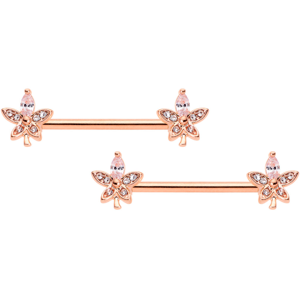 These flowers have such a light and breezy look to it, you might almost expect them to float away! This 14 gauge nipple jewelry is made with 16mm rose gold tone plated over 316L surgical grade stainless steel straight barbells. The ends feature our airy flower charm ends with four of their five petals paved in small clear gems. The top center petal is entirely composed of a single clear gem. Let flowers flourish in your nipple piercings with these fanciful nipple rings! Sold as a set of two.Specifications