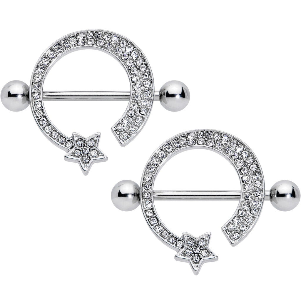 What could be more breathtaking than the sight of a shooting star - like the ones on these 14 gauge nipple shields! They're made with 16mm wearable length 316L surgical grade stainless steel straight barbells with 5mm ball ends and a total length of 20mm. The shield portion is entirely paved with clear gems and features a shooting star with a circular tail. The overall look is simple, yet elegant and eye-catching. These shooting stars are sure to make your nipple piercings the most breathtaking things in the solar system! Sold as a set of two.Specifications