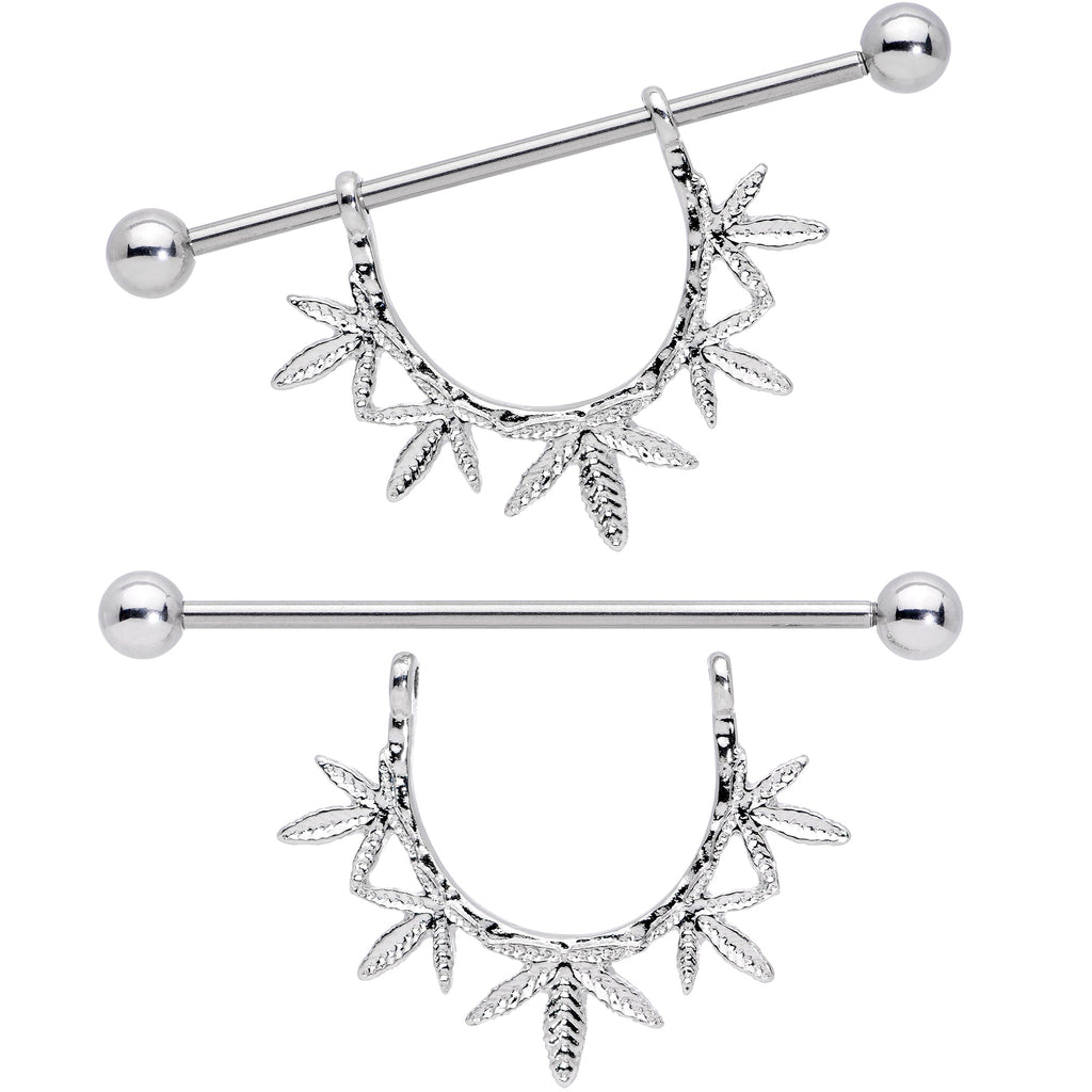 This 14 gauge nipple jewelry will get you high with happiness! It's made with 16mm wearable length 316L surgical grade stainless steel straight barbells with 5mm ball ends. The barbells have a total length of 1 1/2". The shield portion features a circular garland composed of five connected pot leafs. They feature an airy design and textured detailing that will catch even the bleariest eye! Ideal for any dedicated stoner, this weed-themed nipple jewelry is sure to be loved even more than your favorite bong. Sold as a set of two.Specifications