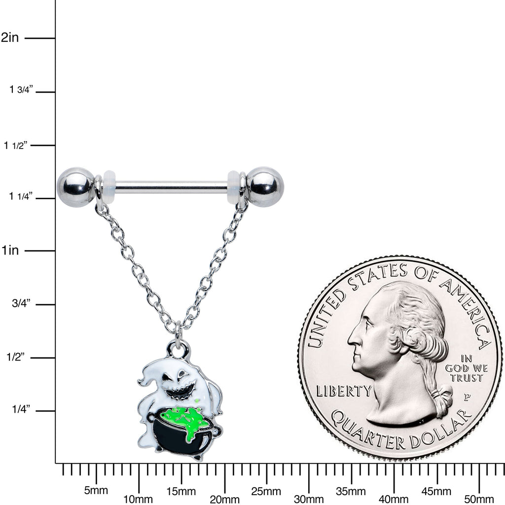Get a creepy cool look for your nipple piercings this Halloween with this 14 gauge nipple jewelry! It's made with a pair of 16mm 316L surgical grade stainless steel straight barbells with 5mm ball ends. Dangling from each barbell is a length of chain that supports a ghost charm. The ghost is inlaid in white and appears to be cackling over a green cauldron. These ghoulish nipple barbells will definitely have you looking sharp this Halloween! Sold as a set of two.