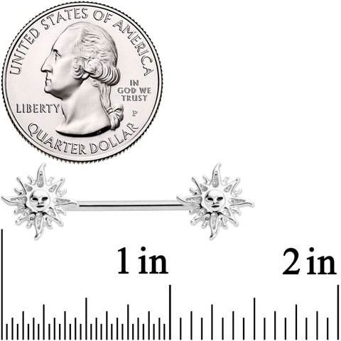 Ever wish you could spend every moment enjoying the sun? Now you really can with these 14 gauge straight barbells. They're 16mm in length and made of durable 316L surgical grade stainless steel straight barbells. Each barbell is capped with detailed suns which are inlaid with glitter, making you and your jewelry as impossible to ignore as the real sun itself. Sold as a set of two.