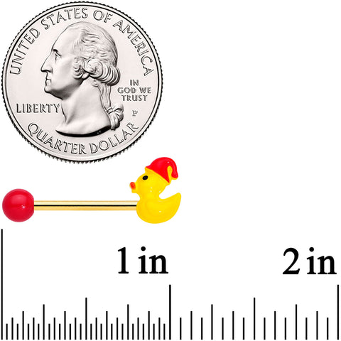 Someone's ready to head to bed on this 14 gauge nipple jewelry! It's made with 16mm gold tone PVD over 316L surgical grade stainless steel straight barbells. One end features an adorable yellow duck charm sporting a jaunty red nightcap. The other end features a 5mm red ball end for a look that is simple, striking, and cohesive. Give your nipple piercings a sweetly dreamy look with these darling ducky nipple rings! Sold as a set of two.