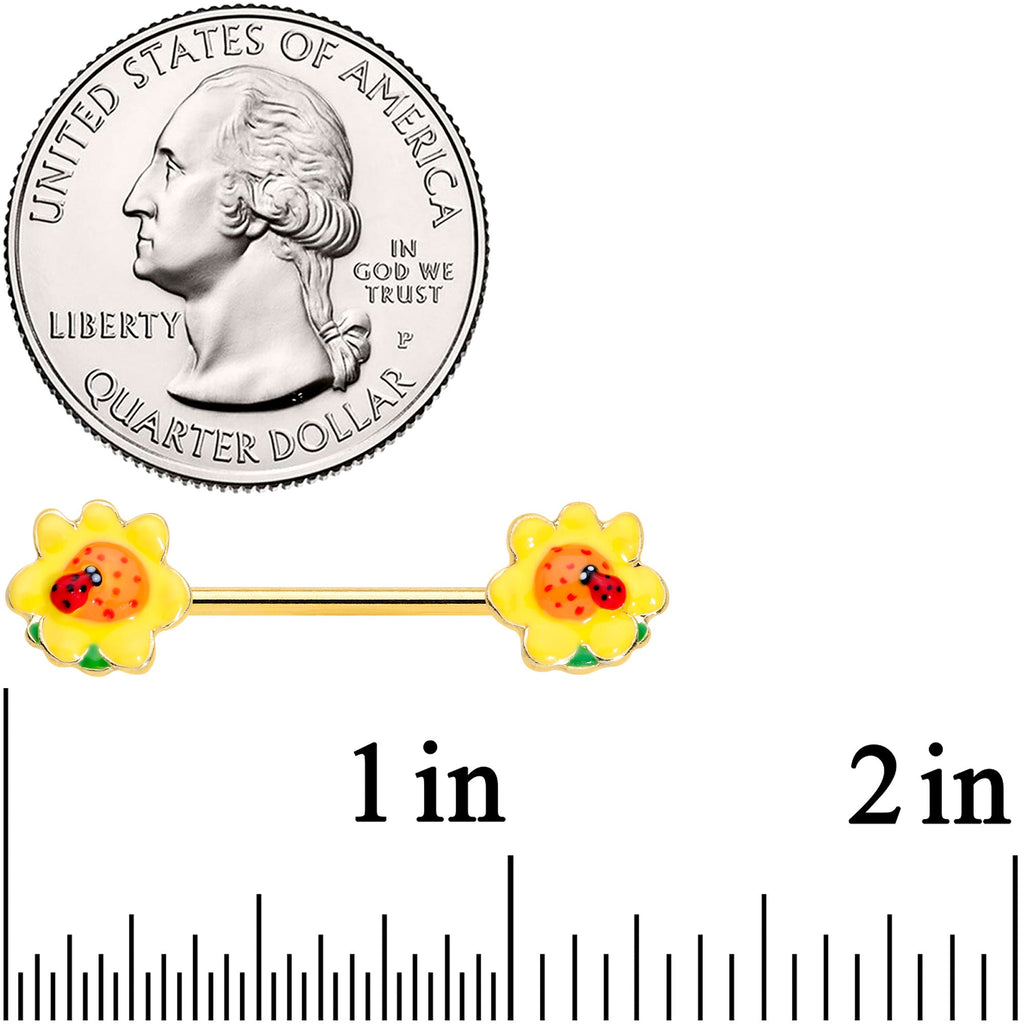 This 14 gauge nipple jewelry is sure to add some sun to the gloomiest day! It's made with 16mm gold tone PVD over 316L surgical grade stainless steel straight barbells. The ends each feature a big yellow flower charm with an orange speckled center and gold tone detailing. Perched on the flower is a tiny red ladybug, clearly looking to enjoy the flower's cheery colors. Add some sunshine to your day with these upbeat floral nipple piercing rings! Sold as a set of two.Specifications