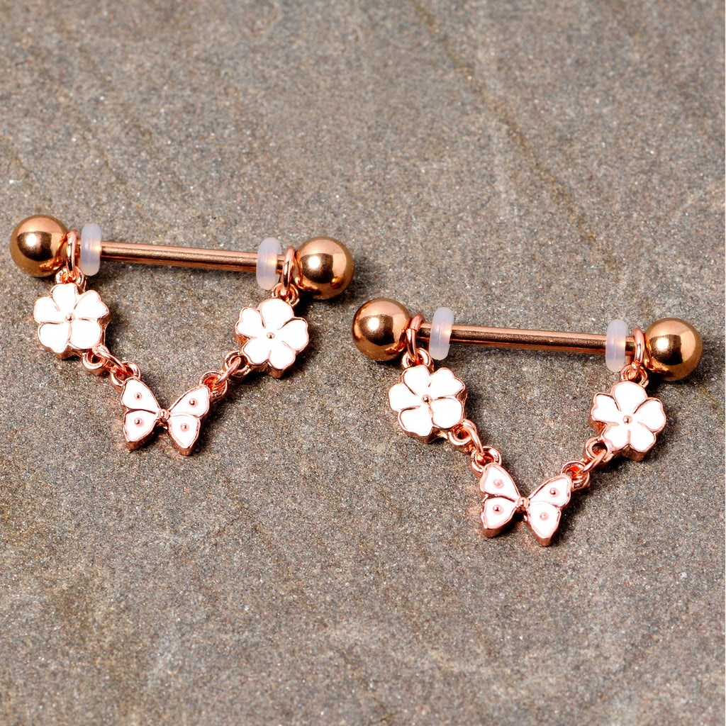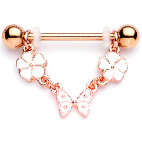 No matter what the season, what could feel more like springtime than flowers and butterflies? These 14 gauge nipple rings are made with 16mm rose gold tone PVD over 316L surgical grade stainless steel straight barbells with 5mm ball ends. They feature a dangling garland featuring a pair of white flower charms. Centered between the flowers is a white butterfly charm. These nipple barbells are sure to have you feeling sunny no matter what the weather forecast is! Sold as a set of two.