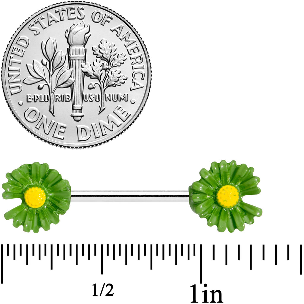 Let the daisies on these 14 gauge nipple piercing rings bedeck your piercings in colorful style! They're made with 16mm durable 316L surgical grade stainless steel straight barbells.The ends each feature a three-dimensional green daisy charm. The flowers also feature textured centers in yellow for extra contrast. Your nipple piercings will blossom with these delicious daisies in them! Sold as a set of two.